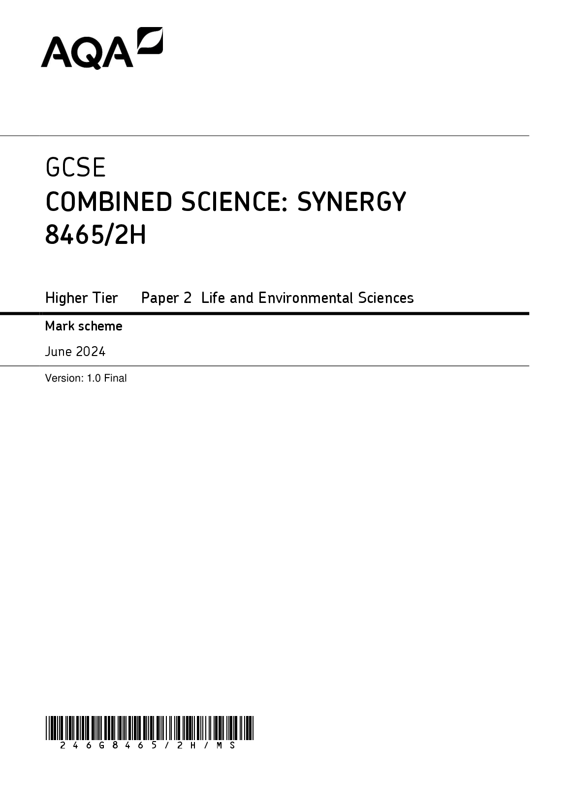2024 AQA GCSE COMBINED SCIENCE PAPER 2 MARK SCHEME(8465/2H:HIGHER TIER)