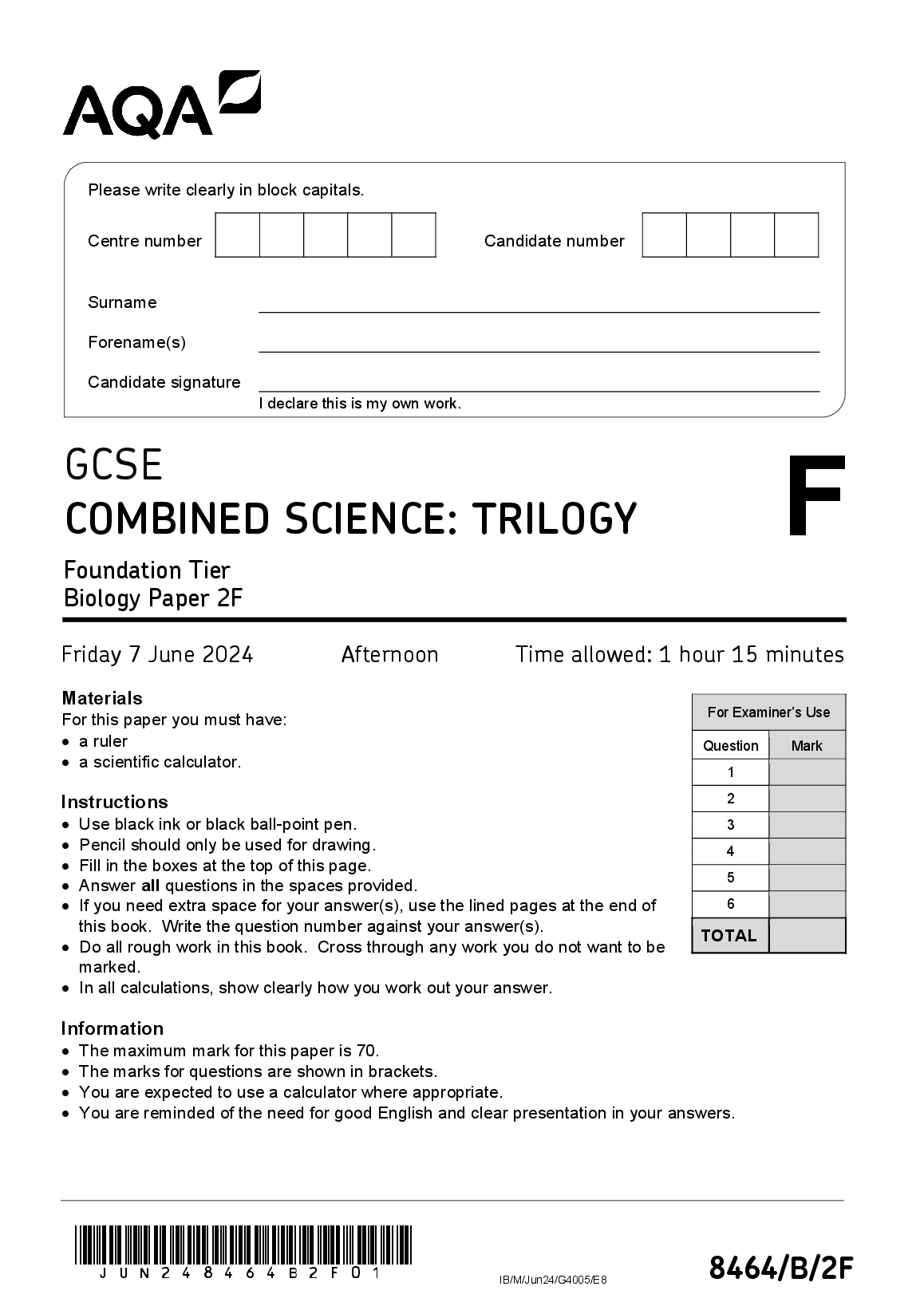 2024 AQA GCSE COMBINED SCIENCE TRILOGY PAPER 1 QP(8464/B/2F:FOUNDATION TIER)