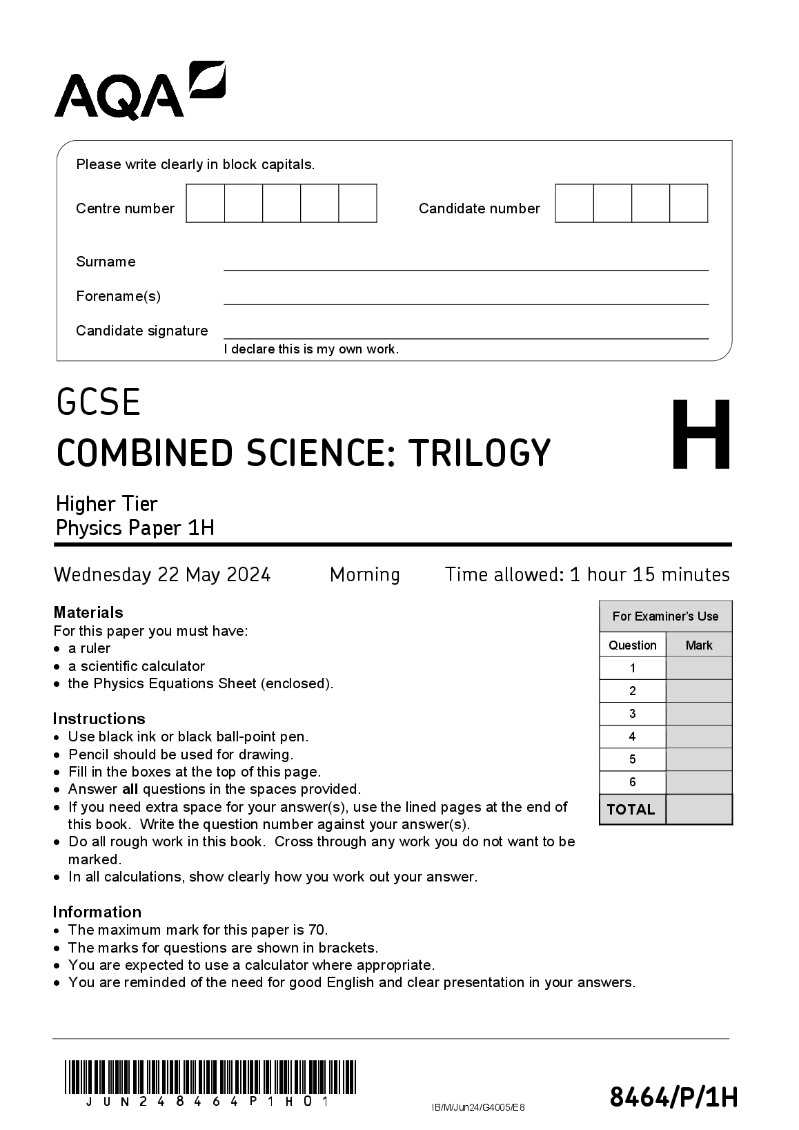 2024 AQA GCSE COMBINED SCIENCE TRILOGY PHYSICS PAPER 1H QP(8464/P/1H:HIGHER TIER)