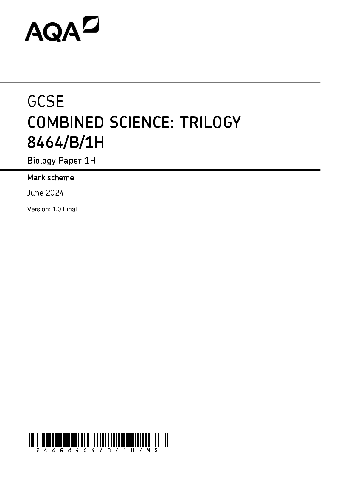 2024 AQA GCSE COMBINED SCIENCE TRILOGY BIOLOGY PAPER 1H MARK SCHEME(8464/B/1H:HIGHER TIER)