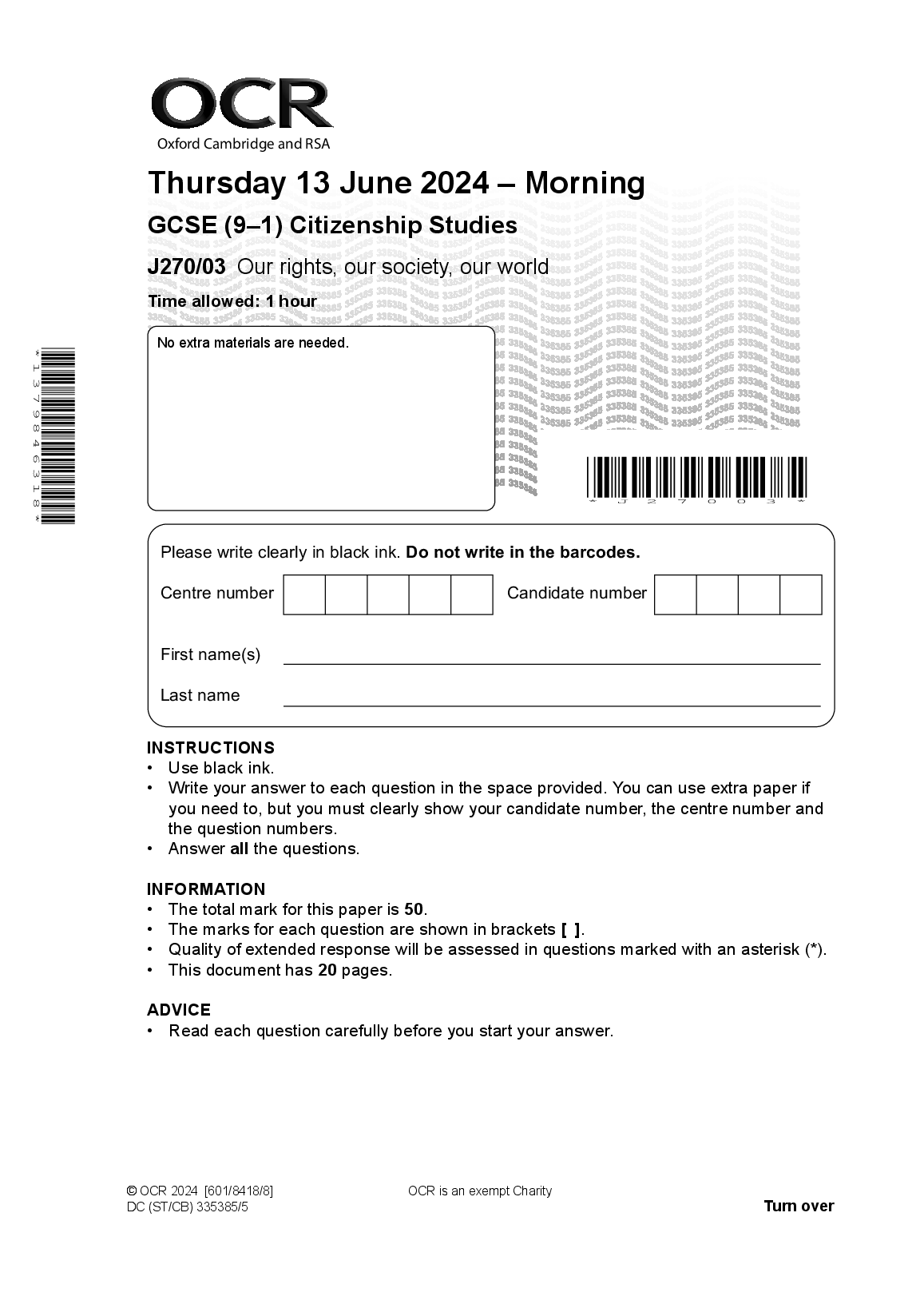 2024 0CR GCSE Citizenship Studies Paper 3 (J270/03: Our rights, our society, our world)