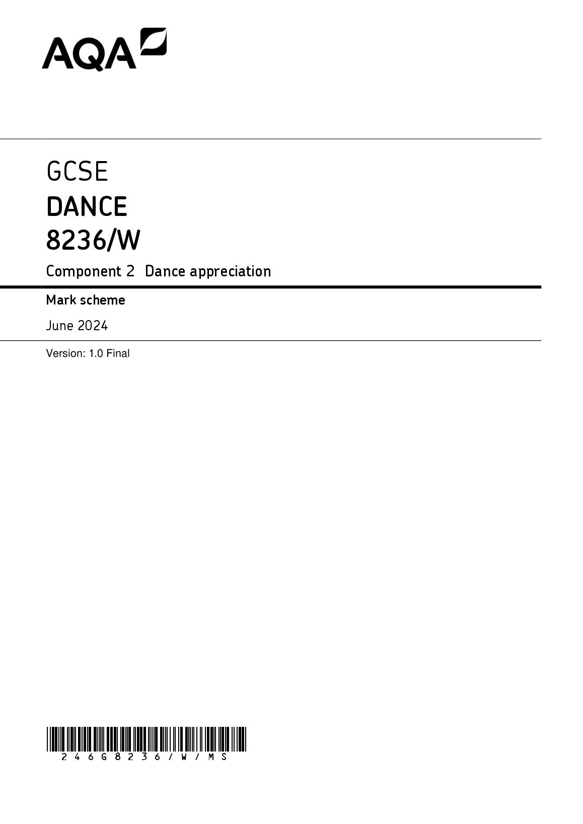 2024 AQA GCSE DANCE COMPONENT 2 MARK SCHEME(8236/W:Dance appreciation)