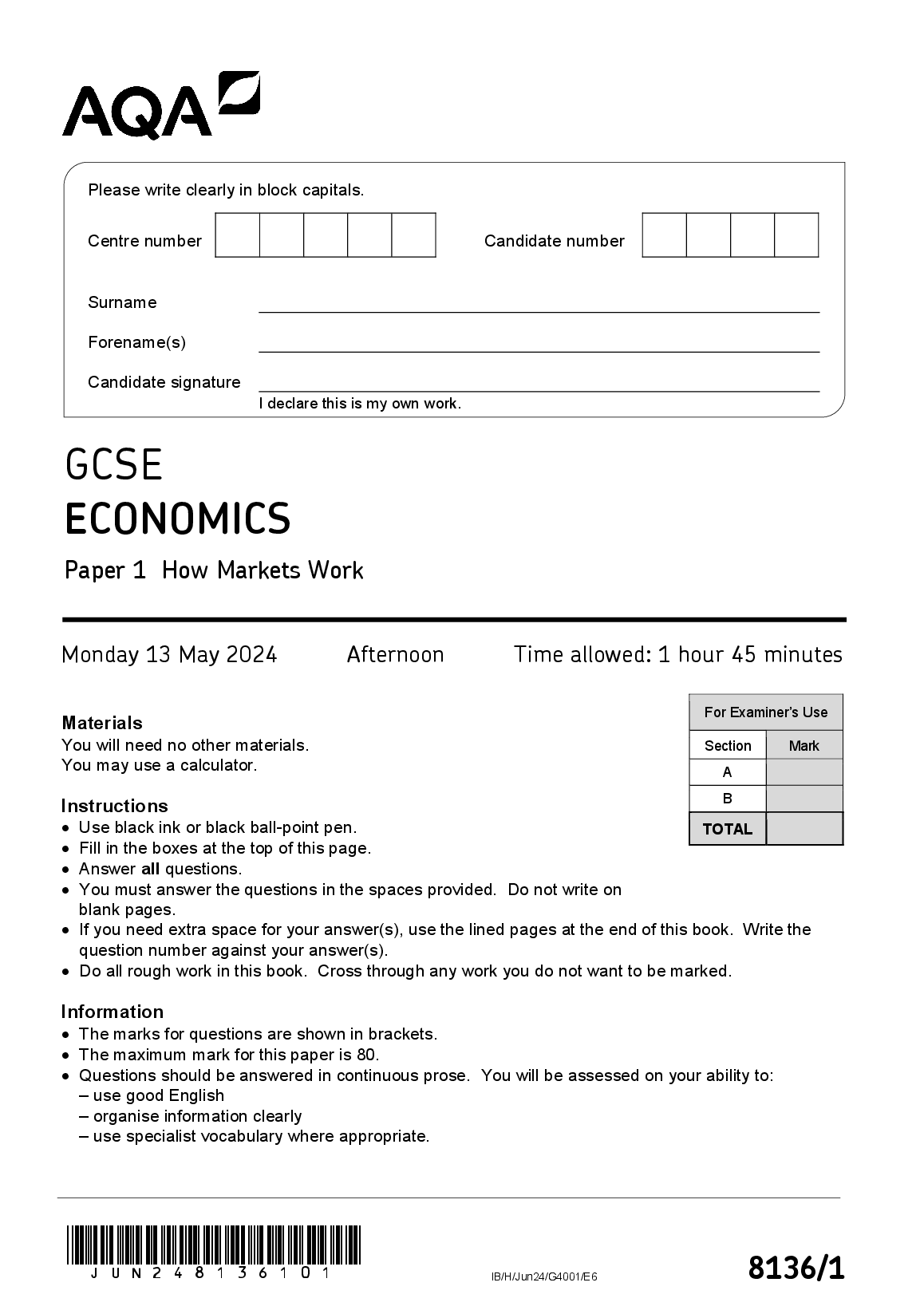2024 AQA GCSE ECONOMICS PAPER 1 QP (8136/1: HOW MARKETS WORK)