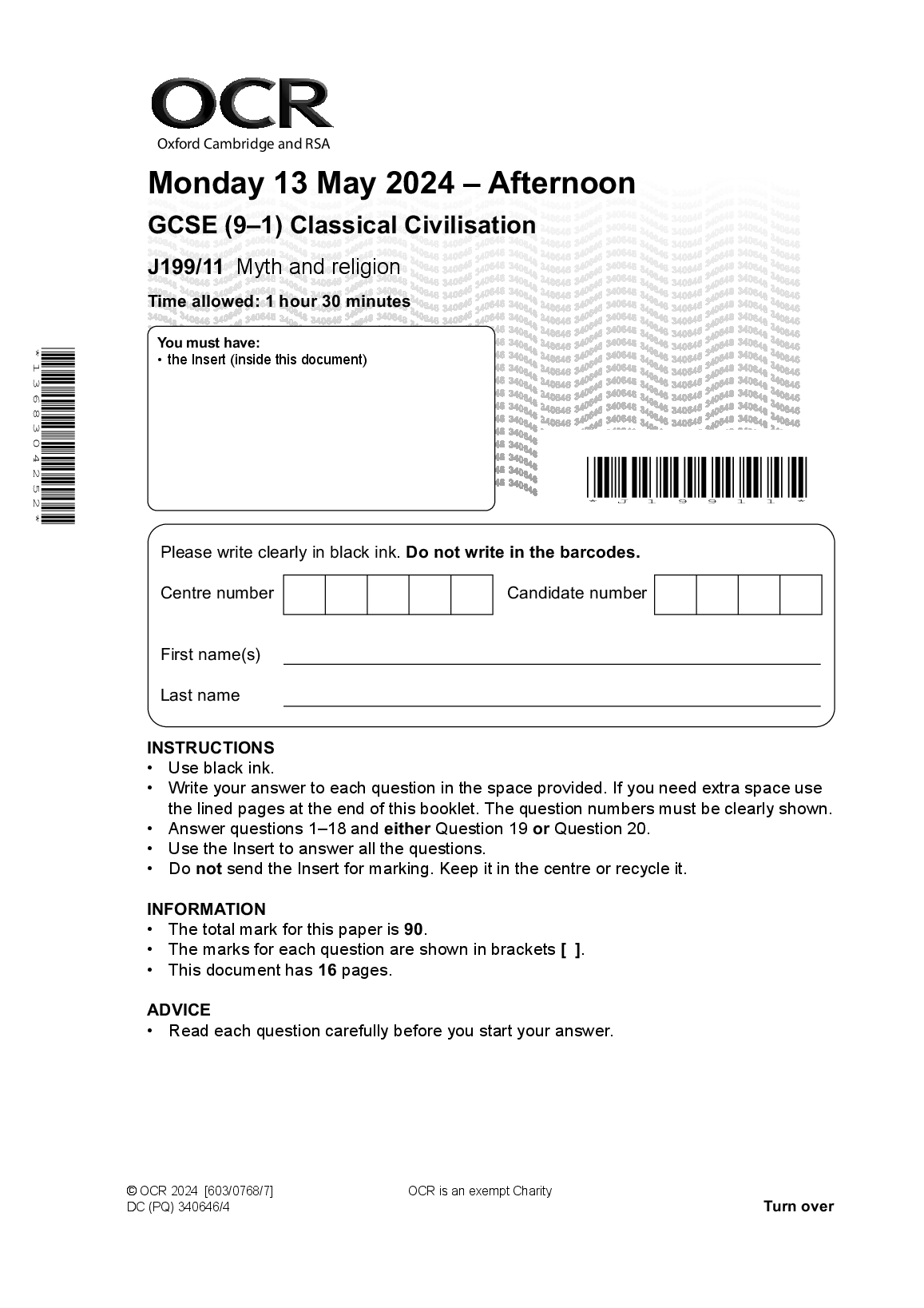 2024 0CR GCSE Classical Civilisation Paper 11 (J199/11: Myth and religion)
