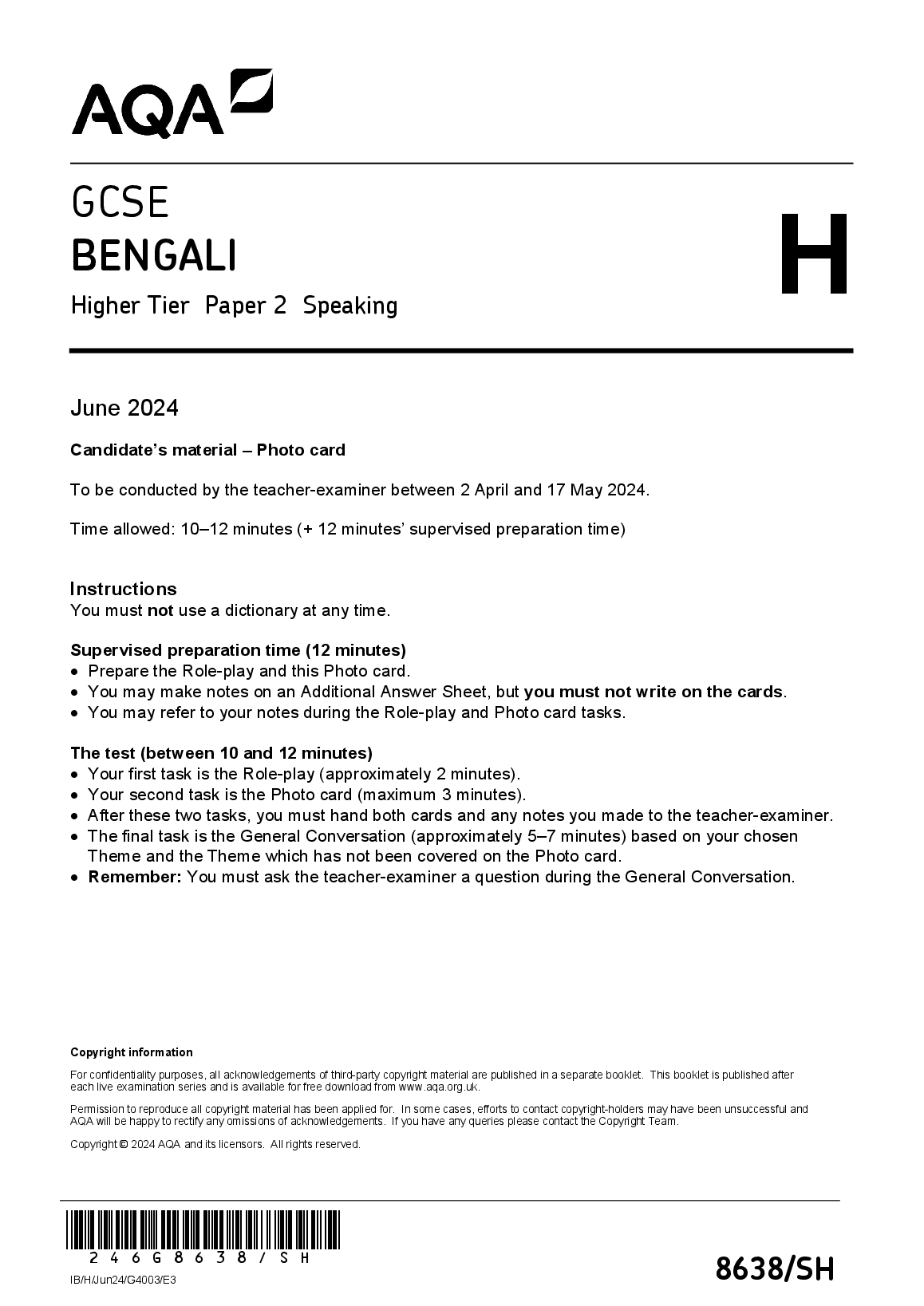 2024 AQA GCSE BENGALI PAPER 2 QP(8638/SH: Speaking)Higher Tier