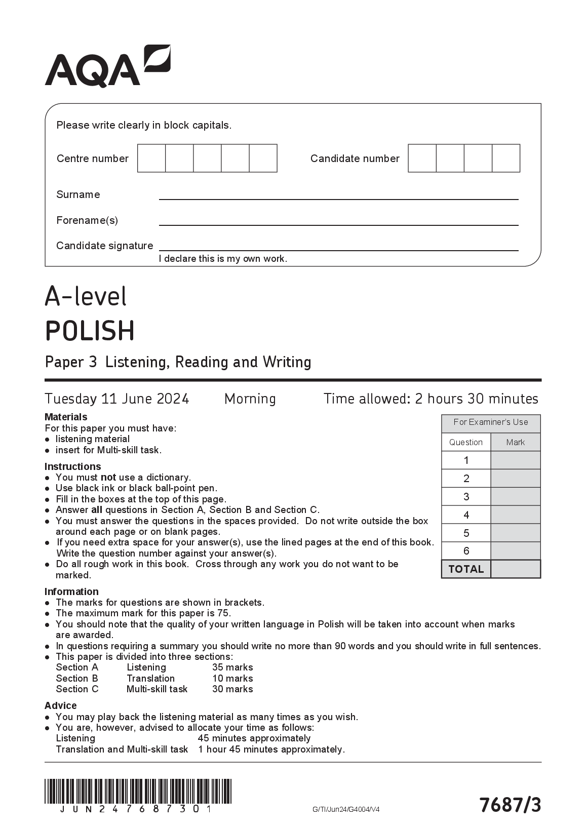 AQA A LEVEL POLISH PAPER 3 QUESTION PAPER (7687/3: Listening, Reading and Writing)