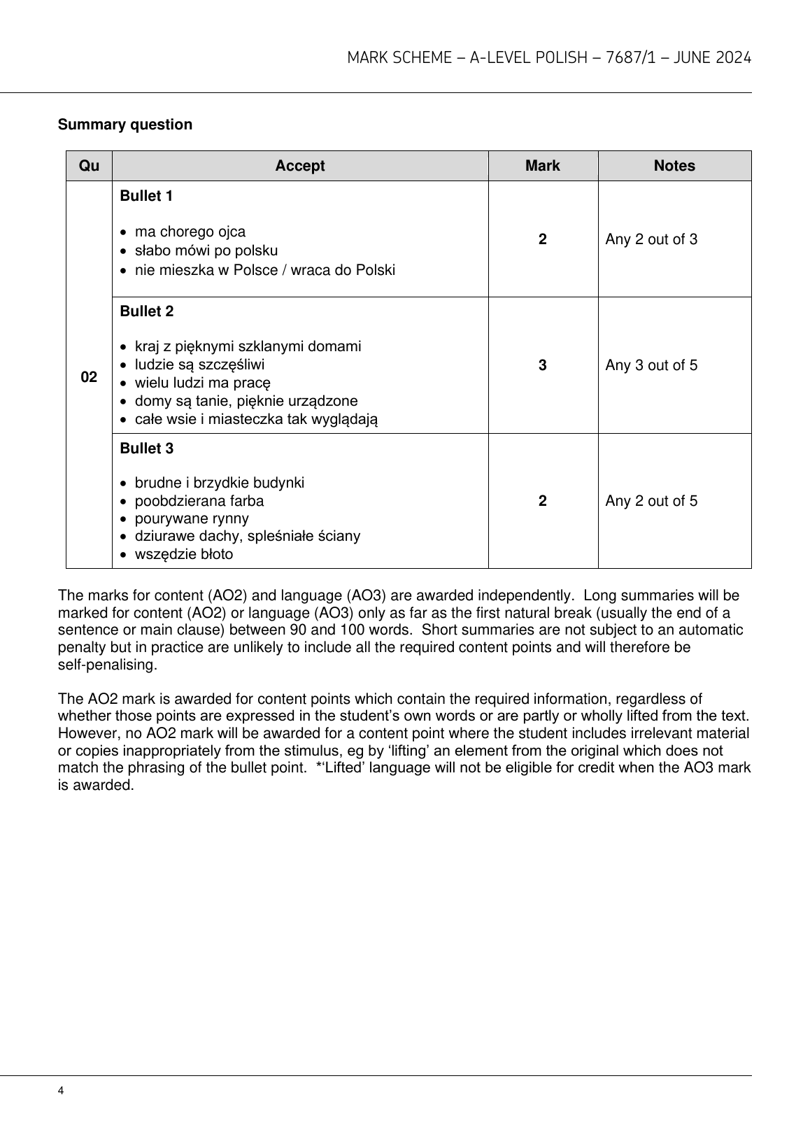 AQA A LEVEL POLISH PAPER 1 MARK SCHEME (7687/1: Reading and Writing)