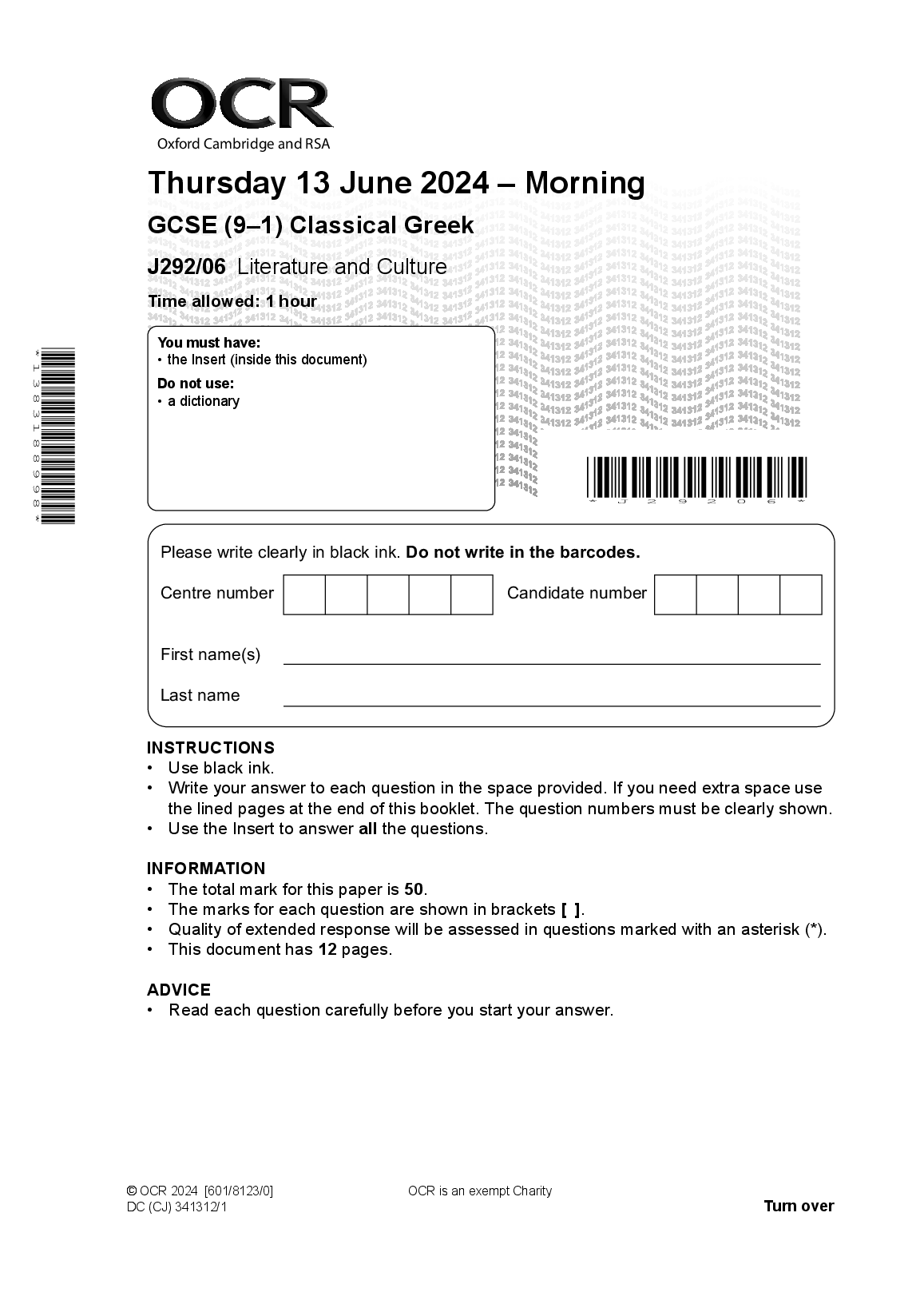 OCR GCSE CLASSICAL GREEK PAPER 6 (J292/06 :Literature and Culture )