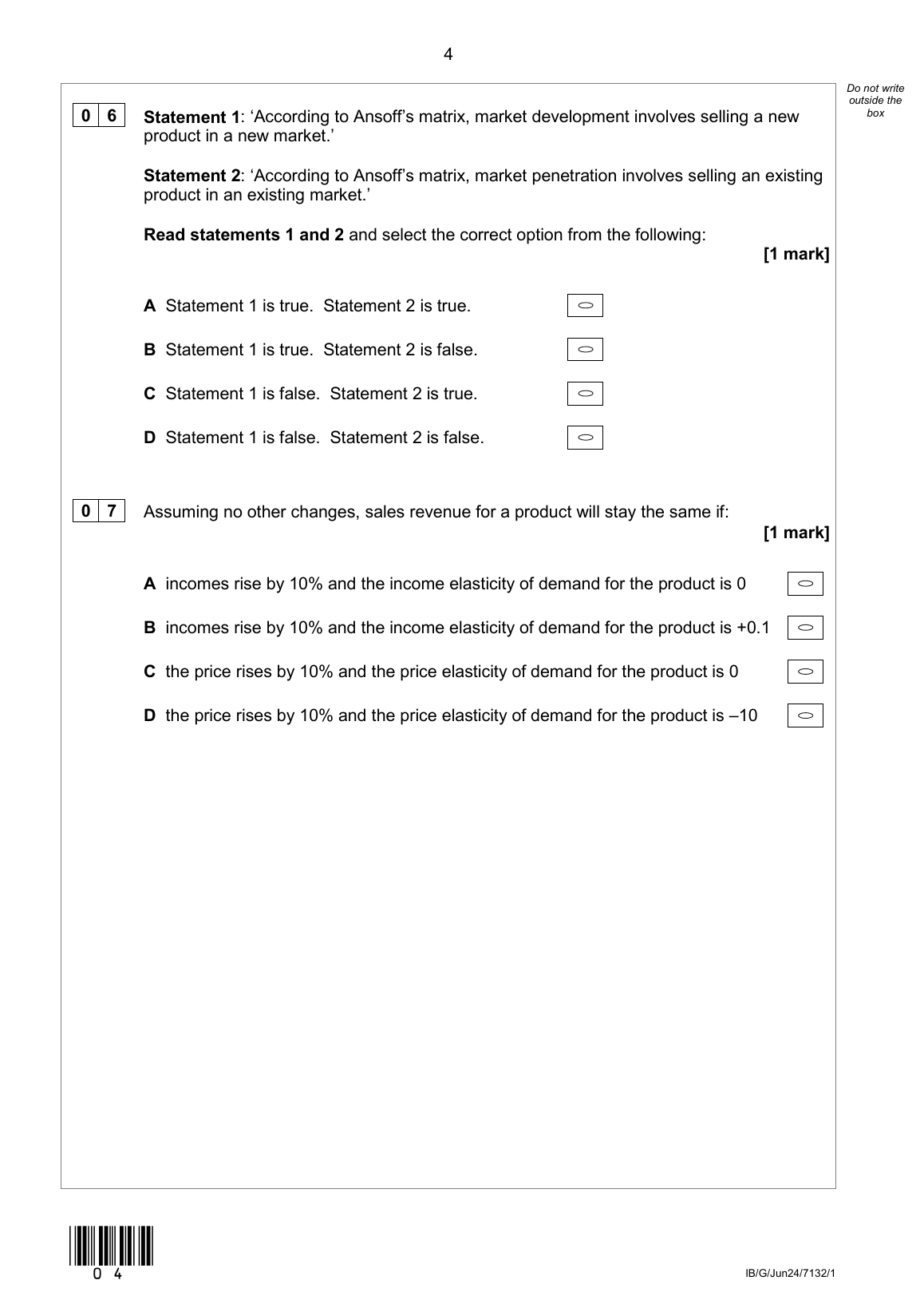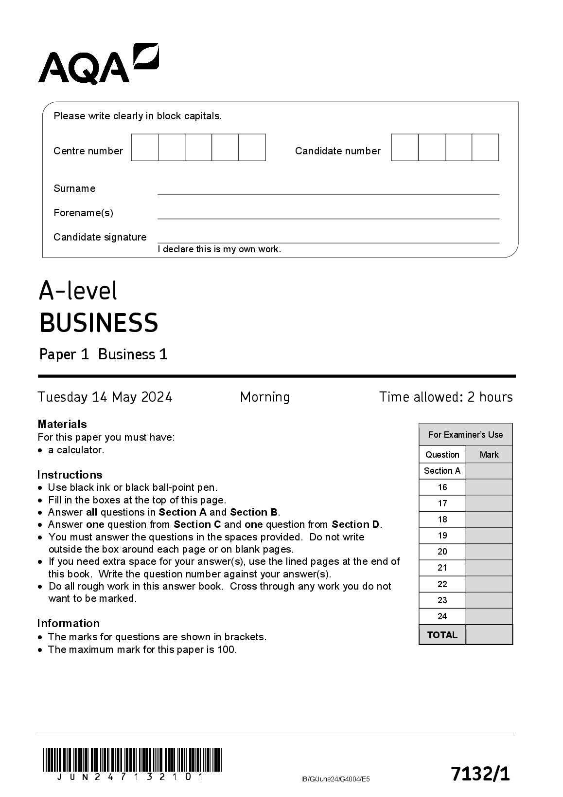 AQA A LEVEL BUSINESS QUESTION PAPER 1 2024 (7132/1: Business 1)