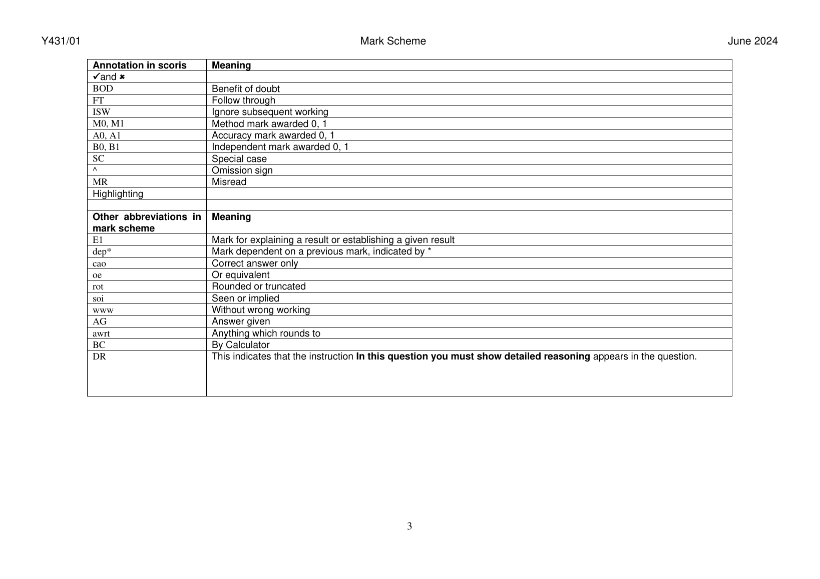 OCR A LEVEL FURTHER MATHEMATICS B PAPER 1 MARK SCHEME 2024 (Y431/01: Mechanics minor)