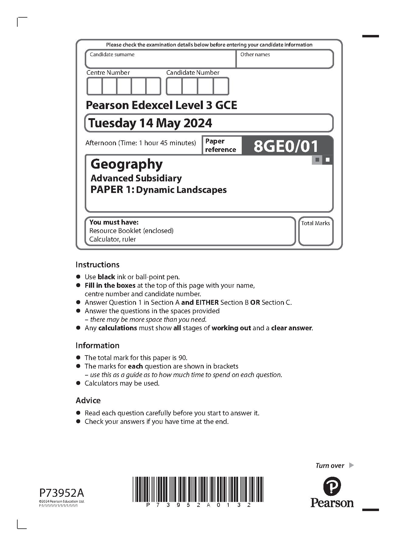 PEARSON EDEXCEL GCE AS LEVEL Geography PAPER 1 QUESTION PAPER 2024: Dynamic Landscapes (8GE0/01)