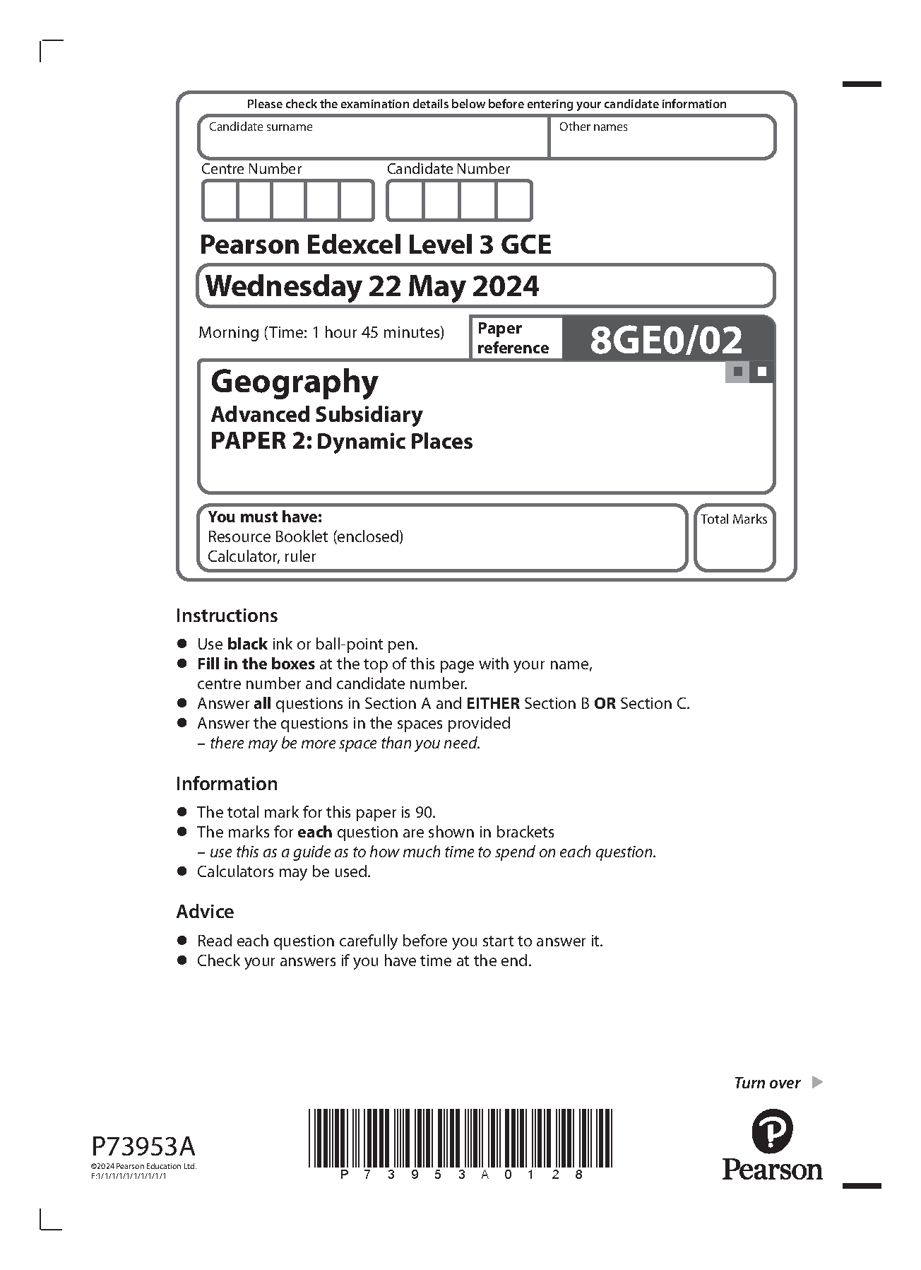 PEARSON EDEXCEL GCE AS LEVEL Geography PAPER 2 QUESTION PAPER 2024: Dynamic Places (8GE0/02)