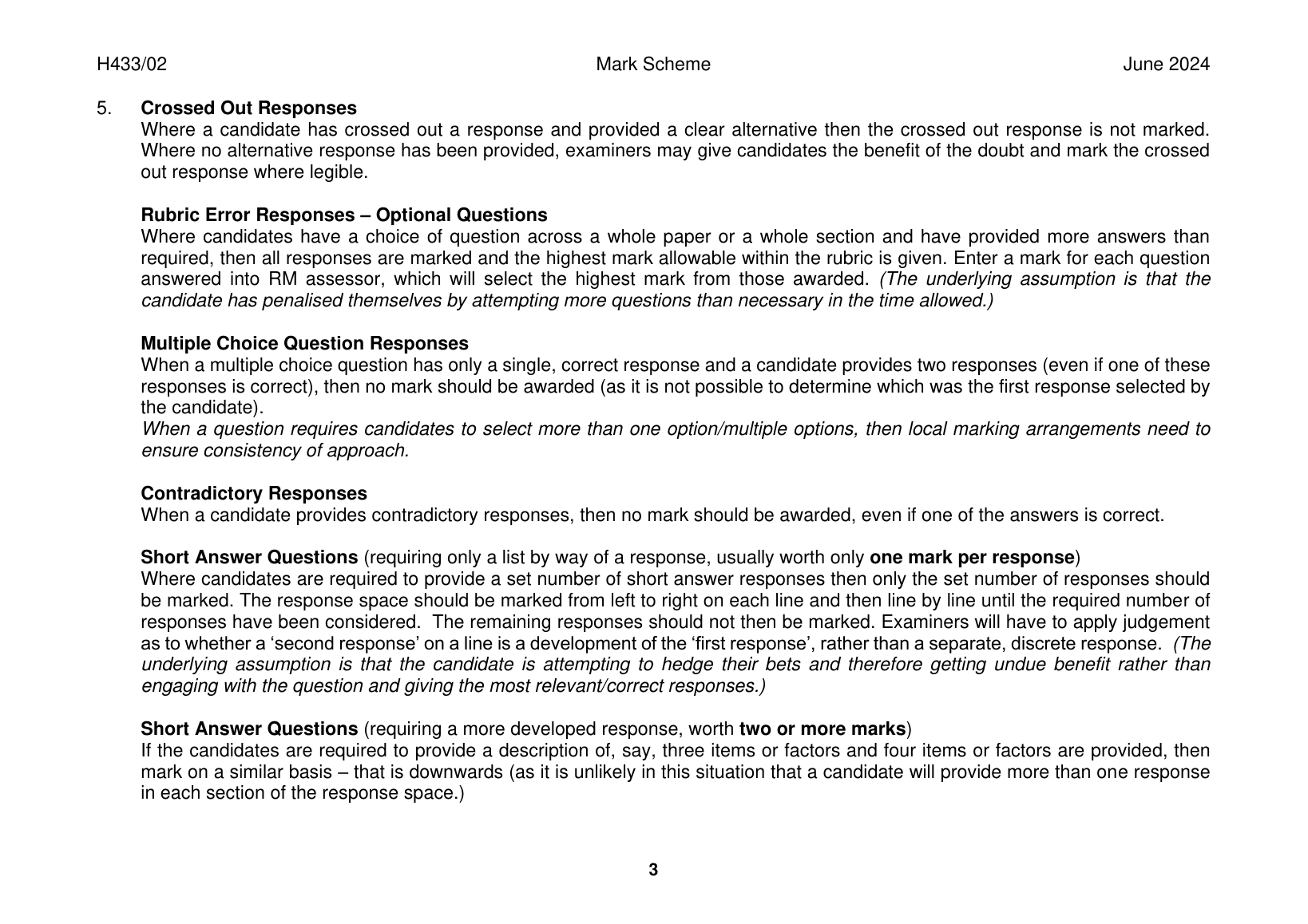 OCR GCE CHEMISTRY B A LEVEL MARK SCHEME 2024(H433/02:SCIENTIFIC LITERACY IN CHEMISTRY)