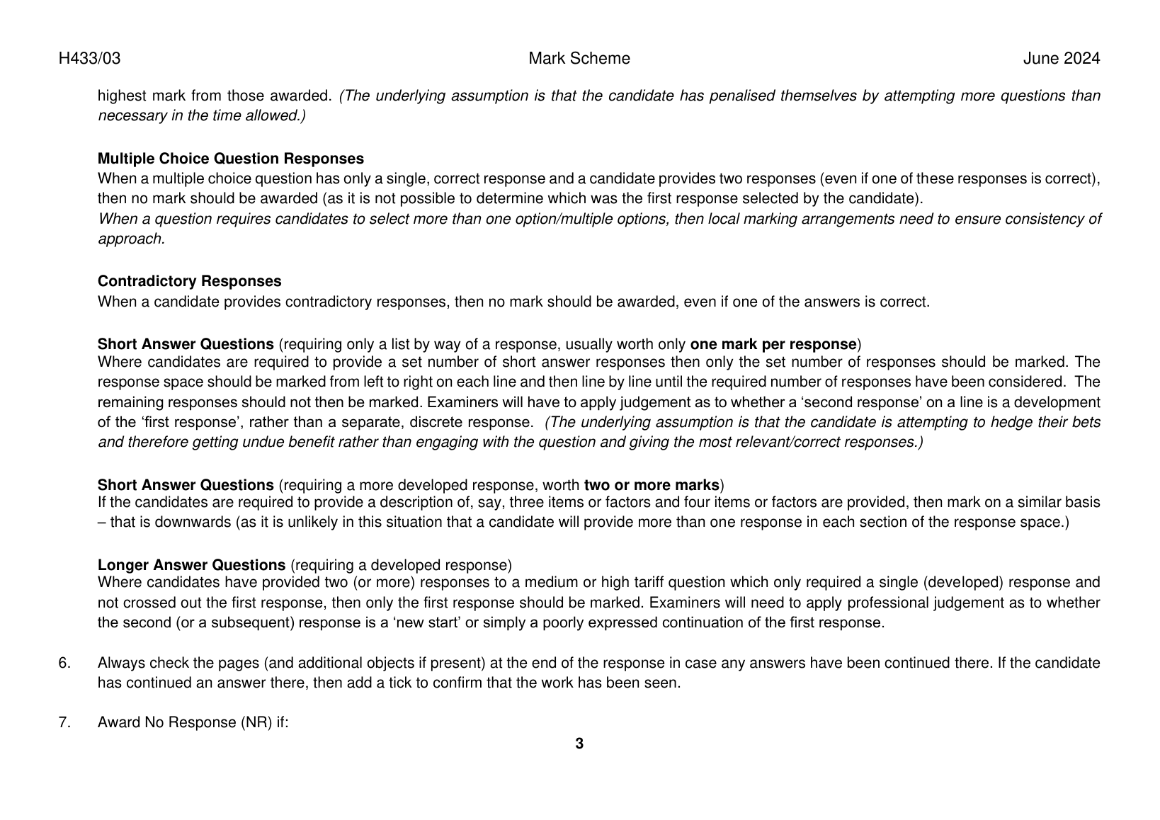 OCR GCE CHEMISTRY B A LEVEL MARK SCHEME 2024(H433/03:PRACTICAL SKILLS IN CHEMISTRY)