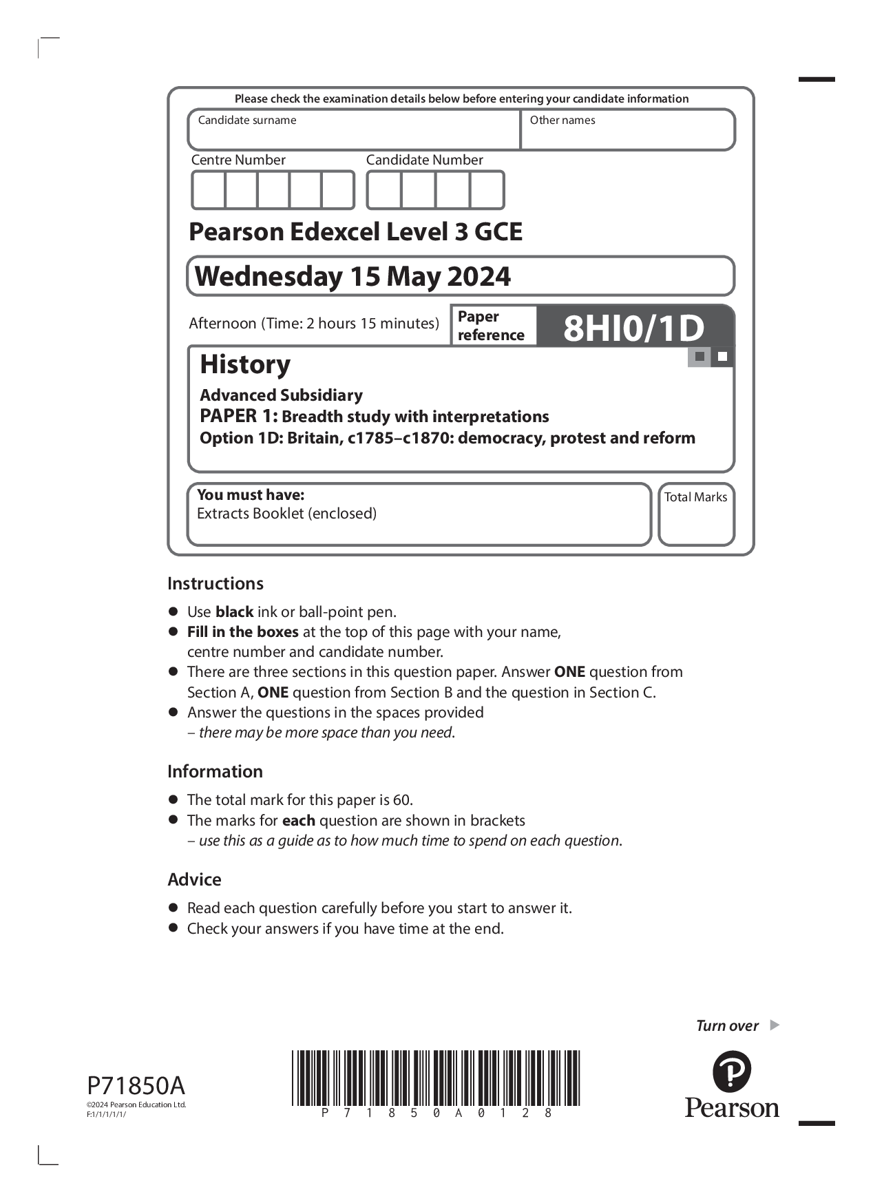 Pearson Edexcel GCE AS Level History PAPER 1 (8HI0/1D) QUESTION PAPER 2024