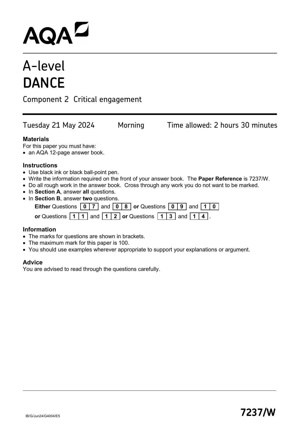 AQA A LEVEL DANCE PAPER 2 2024 (7237/W: Component 2 Critical engagement)