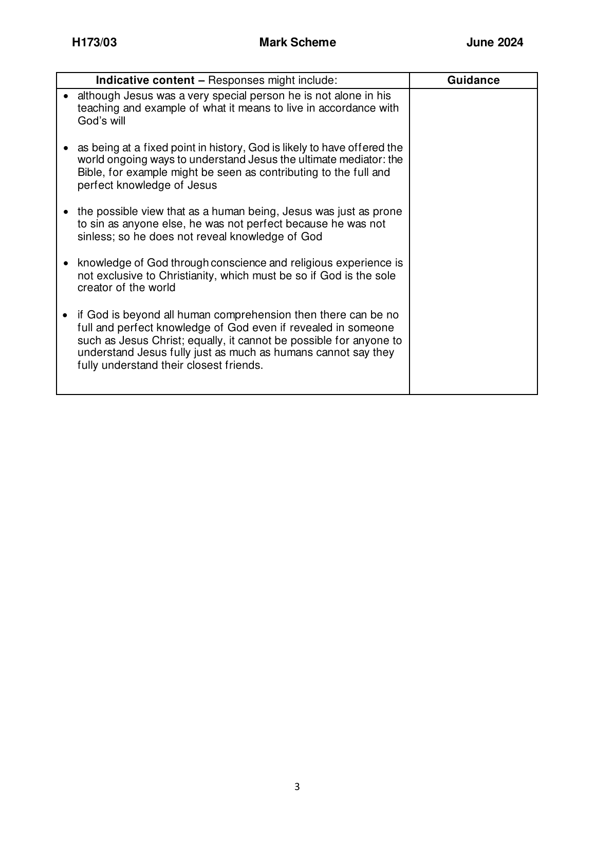 OCR GCE RELIGIOUS STUDIES AS LEVEL MARK SCHEME 2024(H173/03:DEVELOPMENTS IN CHRISTIAN THOUGHT)