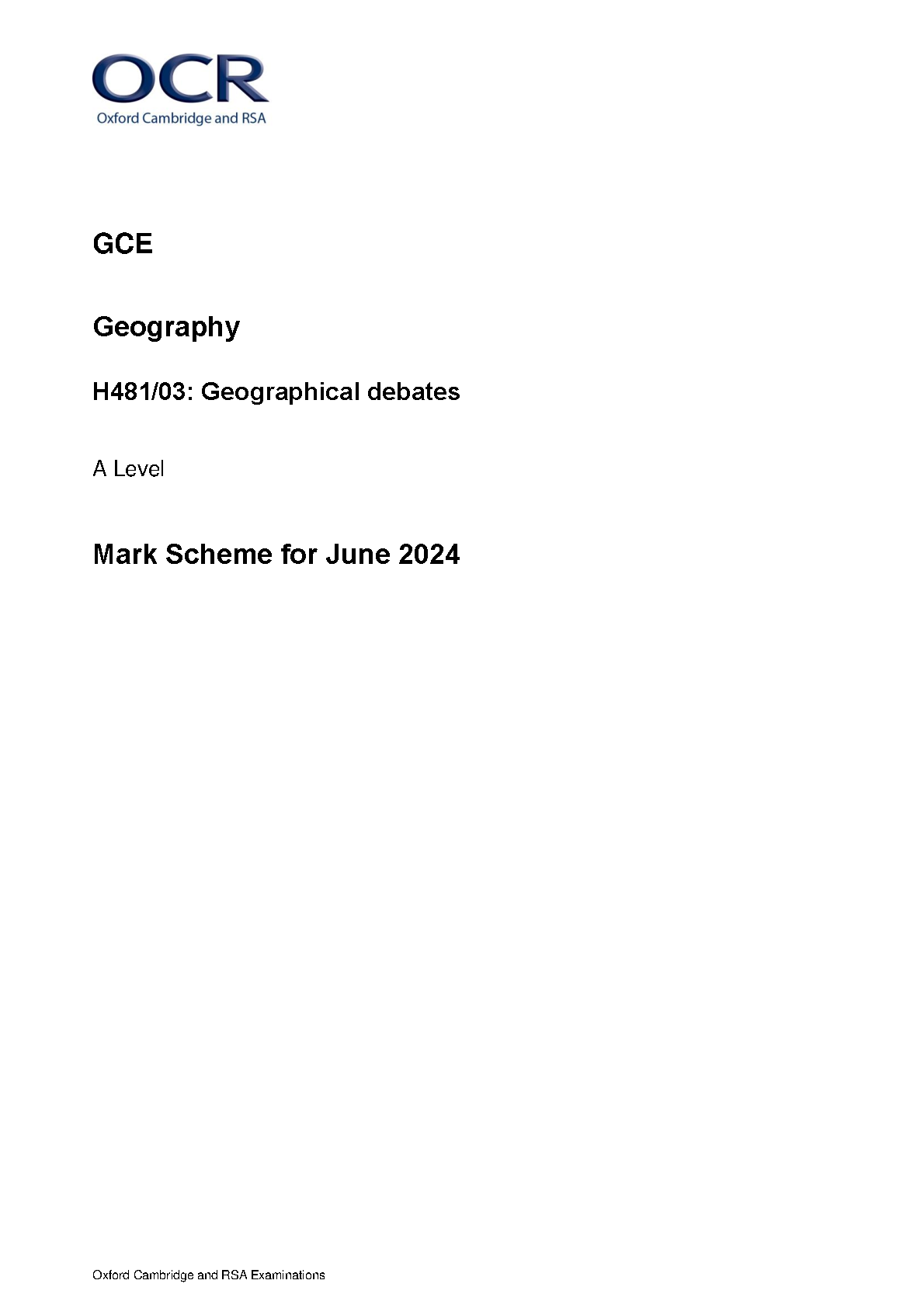 OCR GCE GEOGRAPHY A LEVEL PAPER 3 MARK SCHEME 2024(H481/03:GEOGRAPHICAL DEBATES