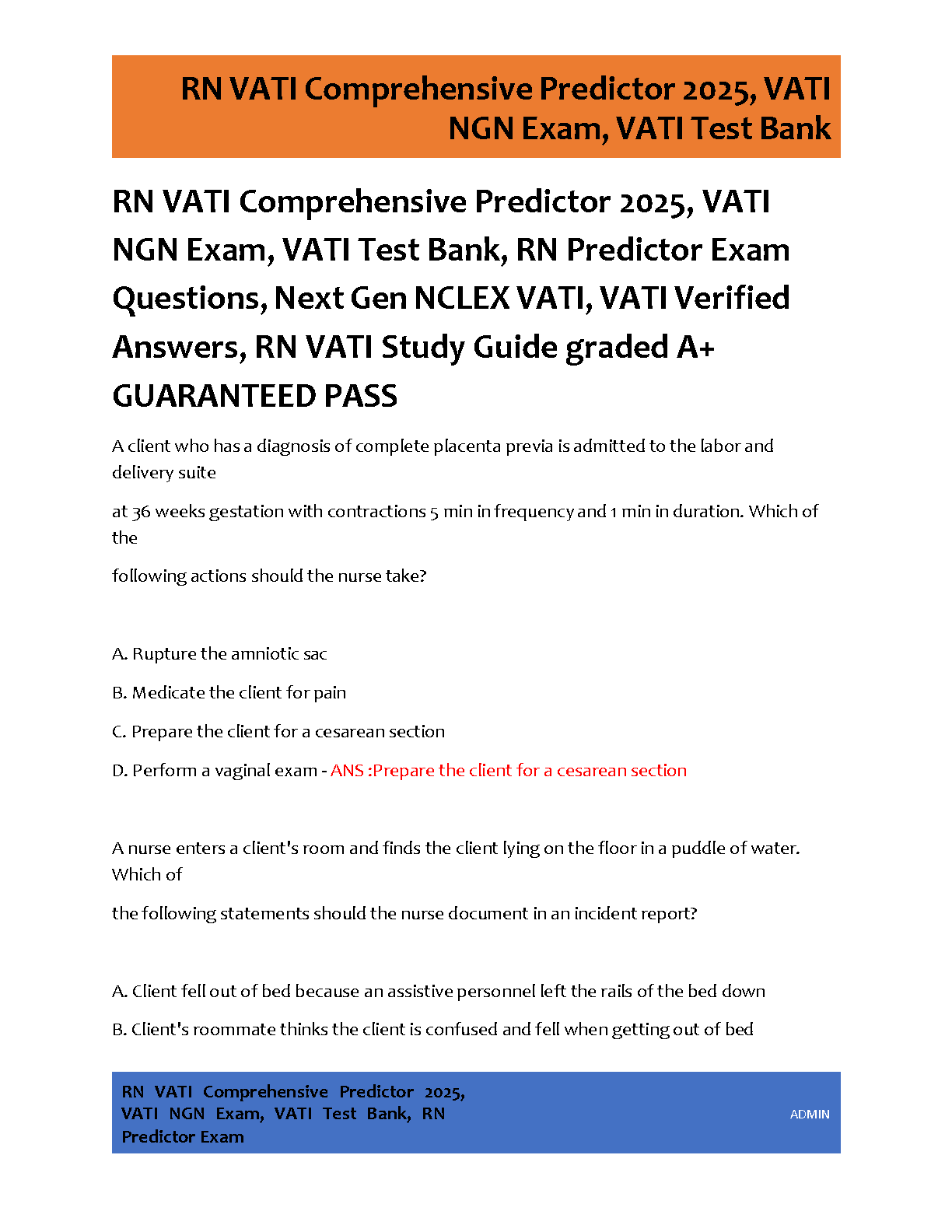 Ace your ATI RN VATI Comprehensive Predictor exam (2024-2025) with this comprehensive study guide featuring verified answers and a 100% pass solution. This resource is designed to help students pass t...