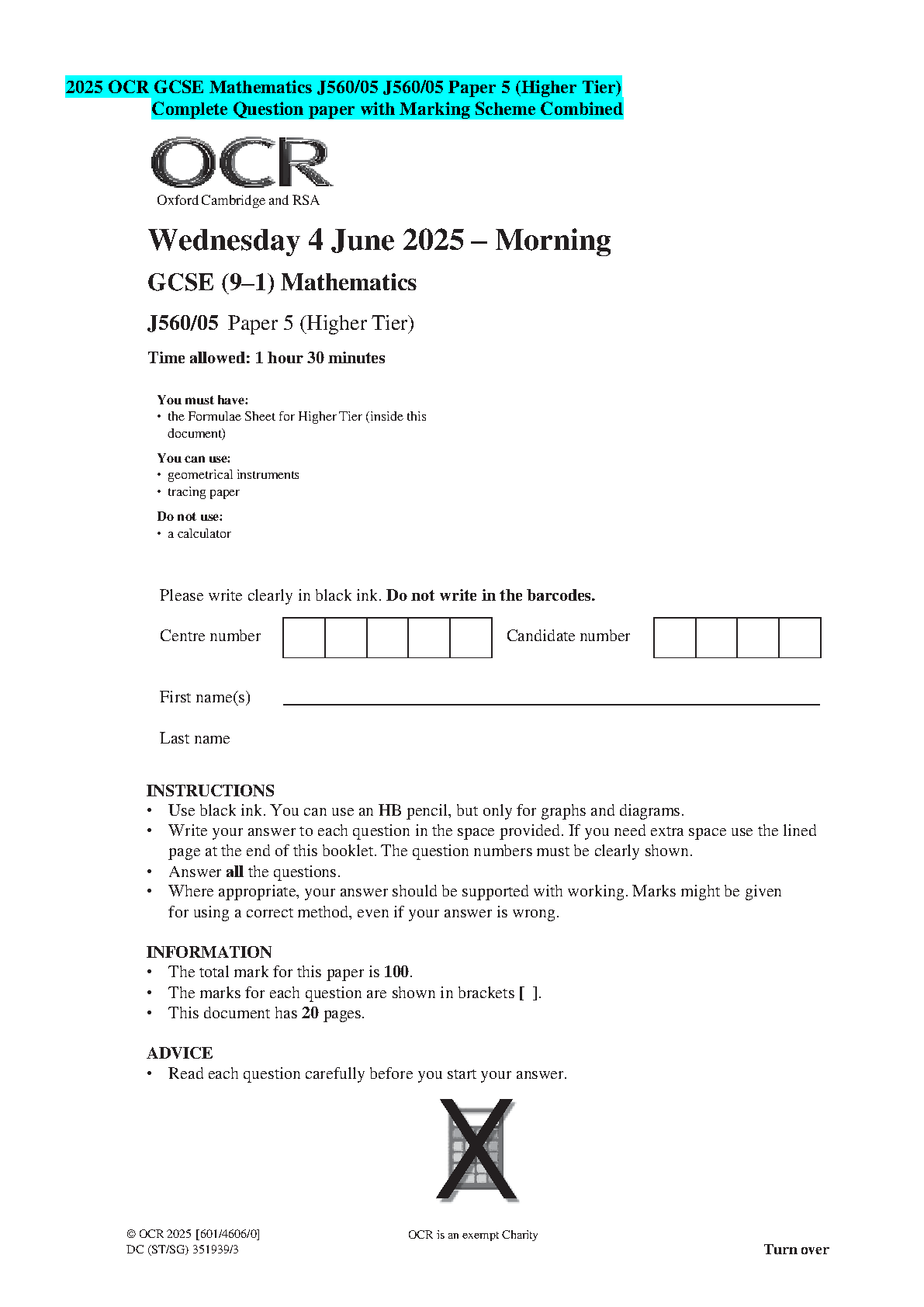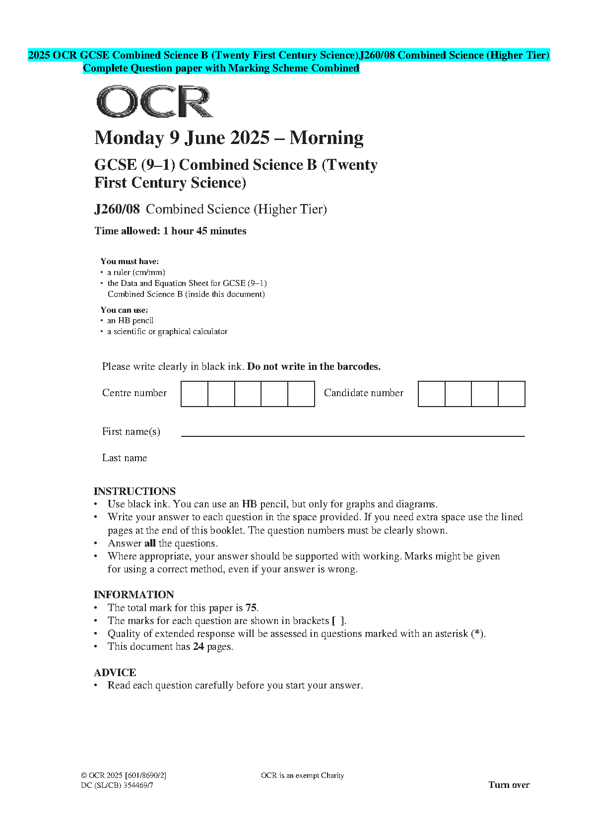 OCR GCSE Physics B Twenty First Century Science J259/03: Breadth in Physics (Higher Tier) 2024 Question Paper and Mark Scheme