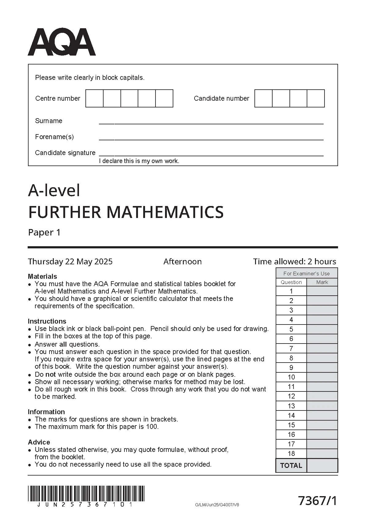 AQA A LEVEL FURTHER MATHEMATICS PAPER 1 2025 (7367/1)