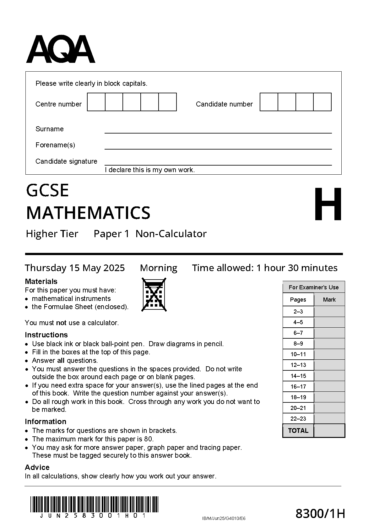 MERGED 2025 AQA GCSE MATHEMATICS Paper 1 and Mark Scheme (8300/1H: Non-Calculator Higher Tier)