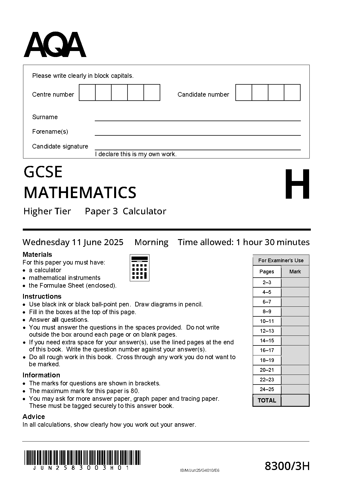 MERGED 2025 AQA GCSE MATHEMATICS Paper 3 and Mark Scheme (8300/3H: Calculator Higher Tier)