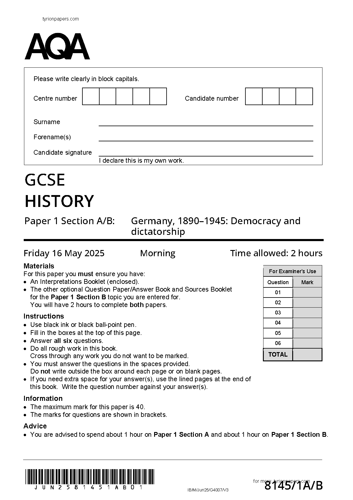 MERGED 2025 AQA GCSE HISTORY Paper 1 Section AB Question Paper and Mark Scheme (8145/1A/B: Germany, 1890–1945: Democracy and dictatorship)