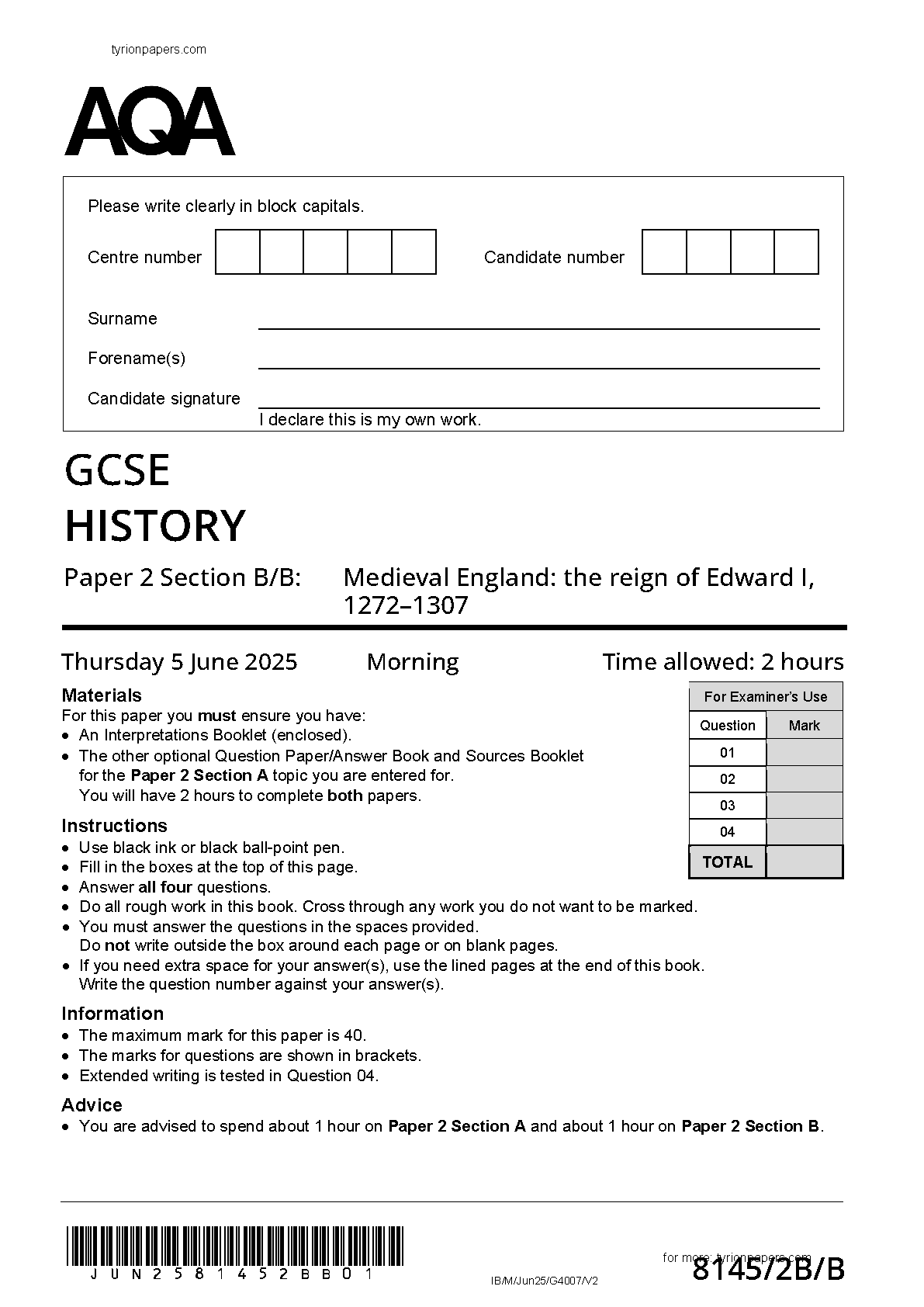 MERGED 2025 AQA GCSE HISTORY Paper 2 Section B/B and Mark Scheme (8145/2B/B: Medieval England: the reign of Edward I, 1272–1307)