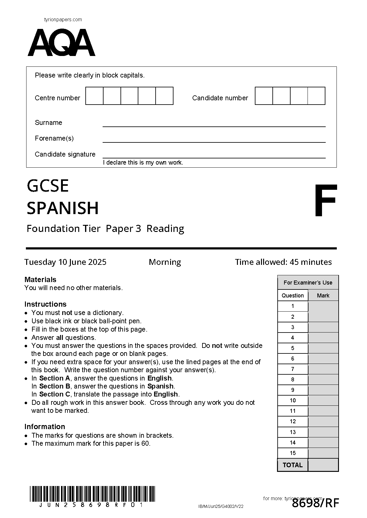 MERGED 2025 AQA GCSE SPANISH Paper 3 and Mark Scheme (8698/RF: Reading Foundation Tier)