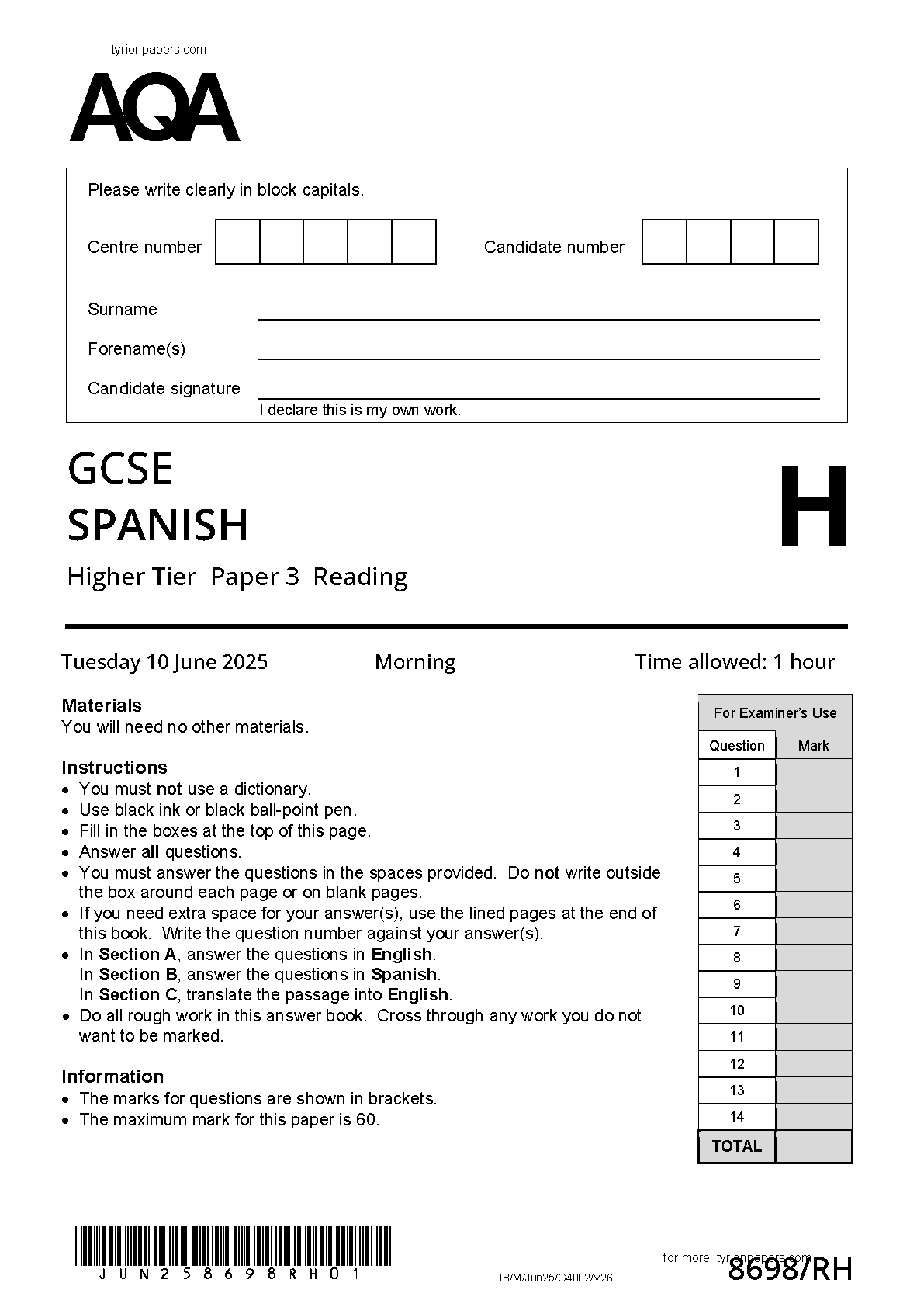 MERGED 2025 AQA GCSE SPANISH Paper 3 and Mark Scheme (8698/RH: Reading Higher Tier)