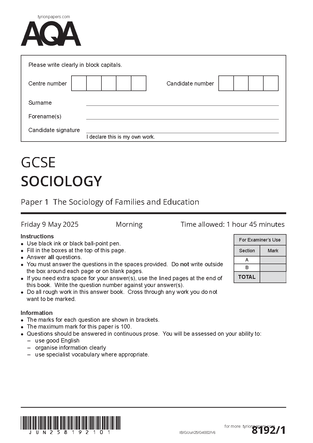 MERGED 2025 AQA GCSE SOCIOLOGY Paper 1 and Mark Scheme (8192/1: The Sociology of Families and Education)