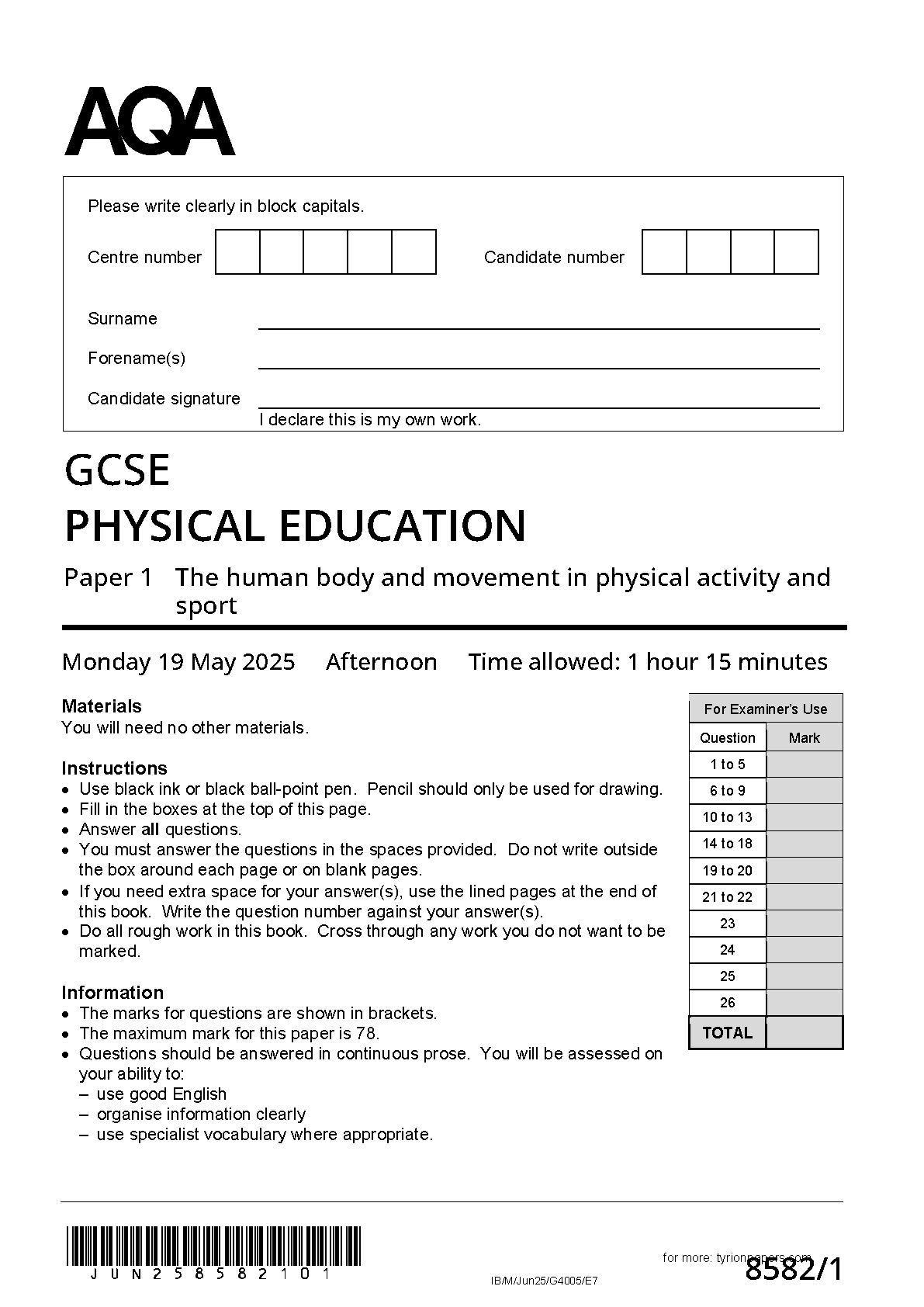 MERGED 2025 AQA GCSE PHYSICAL EDUCATION Paper 1 Question Paper and Mark Scheme (8582/1: The human body and movement in physical activity and sport)