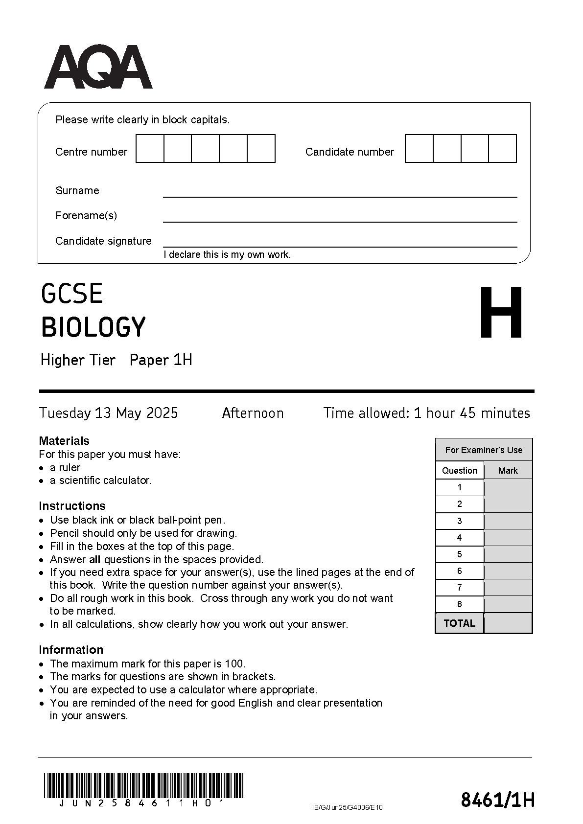 MERGED 2025 AQA GCSE BIOLOGY Paper 1 Question Paper and Mark Scheme (8461/1H: Higher Tier)