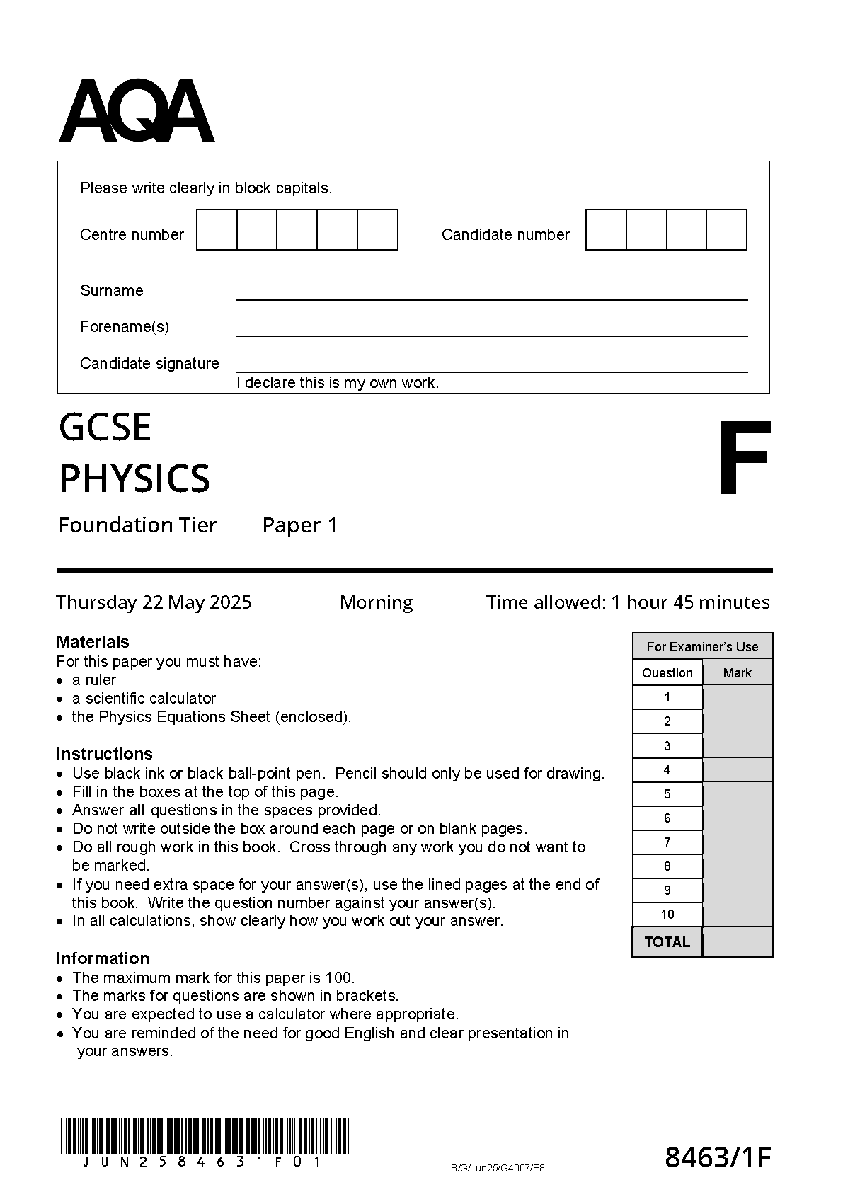 MERGED 2025 AQA GCSE PHYSICS Paper 1 Question Paper and Mark Scheme (8463/1F: Foundation Tier)