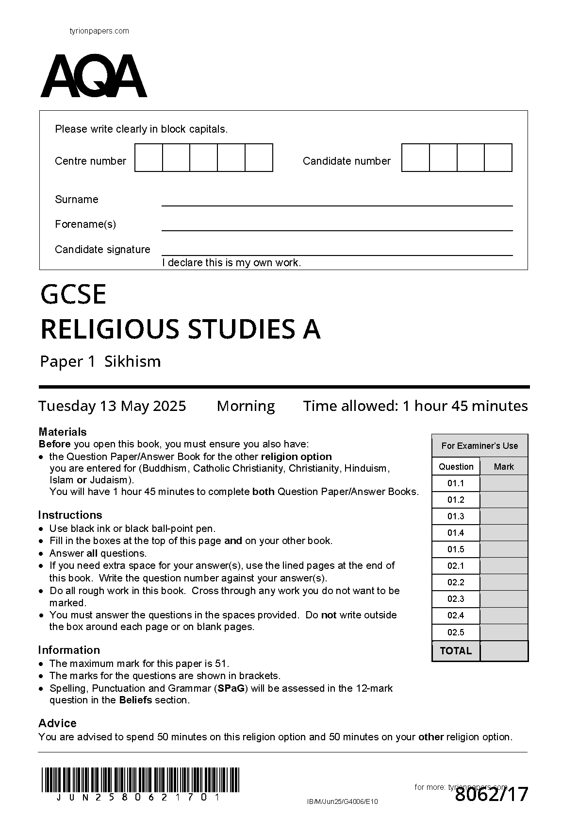 MERGED 2025 AQA GCSE RELIGIOUS STUDIES A Paper 1 Question Paper and Mark Scheme (8062/17: Sikhism)