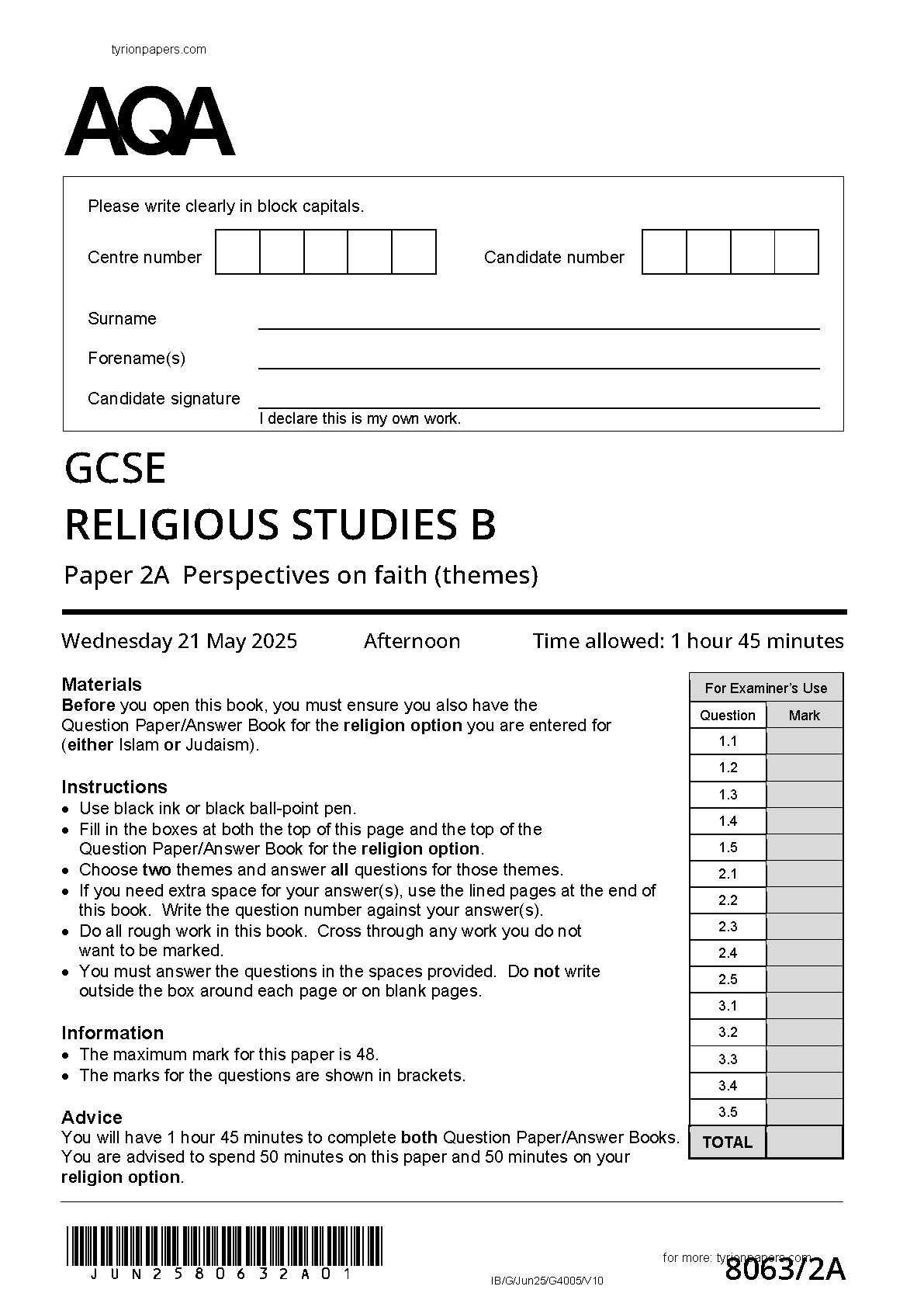 MERGED 2025 AQA GCSE RELIGIOUS STUDIES B Paper 2A Question Paper and Mark Scheme (8063/2A: Perspectives on faith (themes))