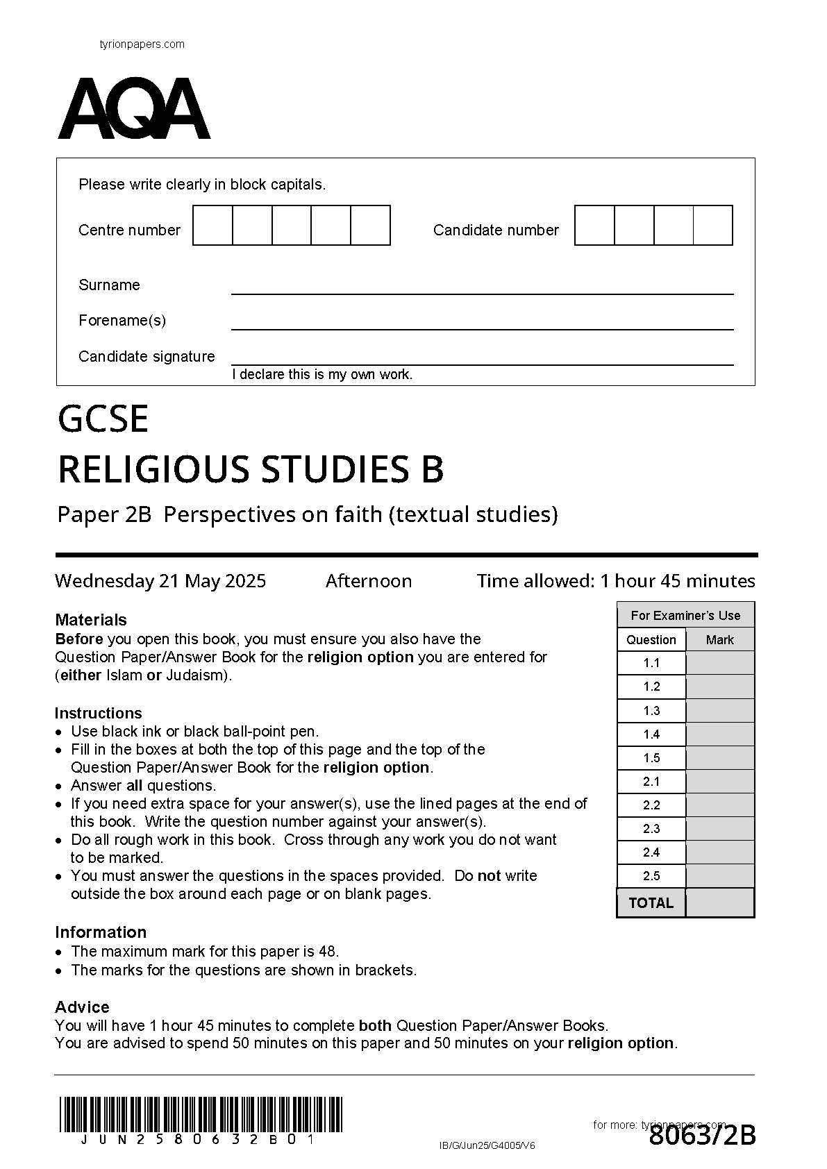 MERGED 2025 AQA GCSE RELIGIOUS STUDIES B Paper 2B Question Paper and Mark Scheme (8063/2B: Perspectives on faith (textual studies)