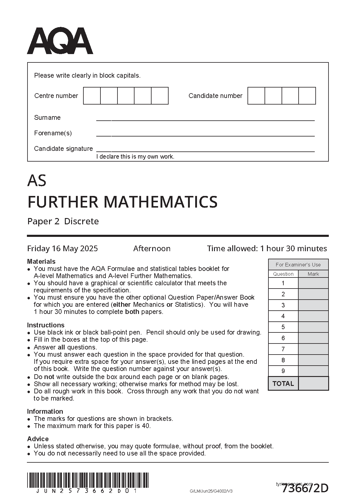 2025 AQA AS Level FURTHER MATHEMATICS Paper 2 (7366/02: Discrete)