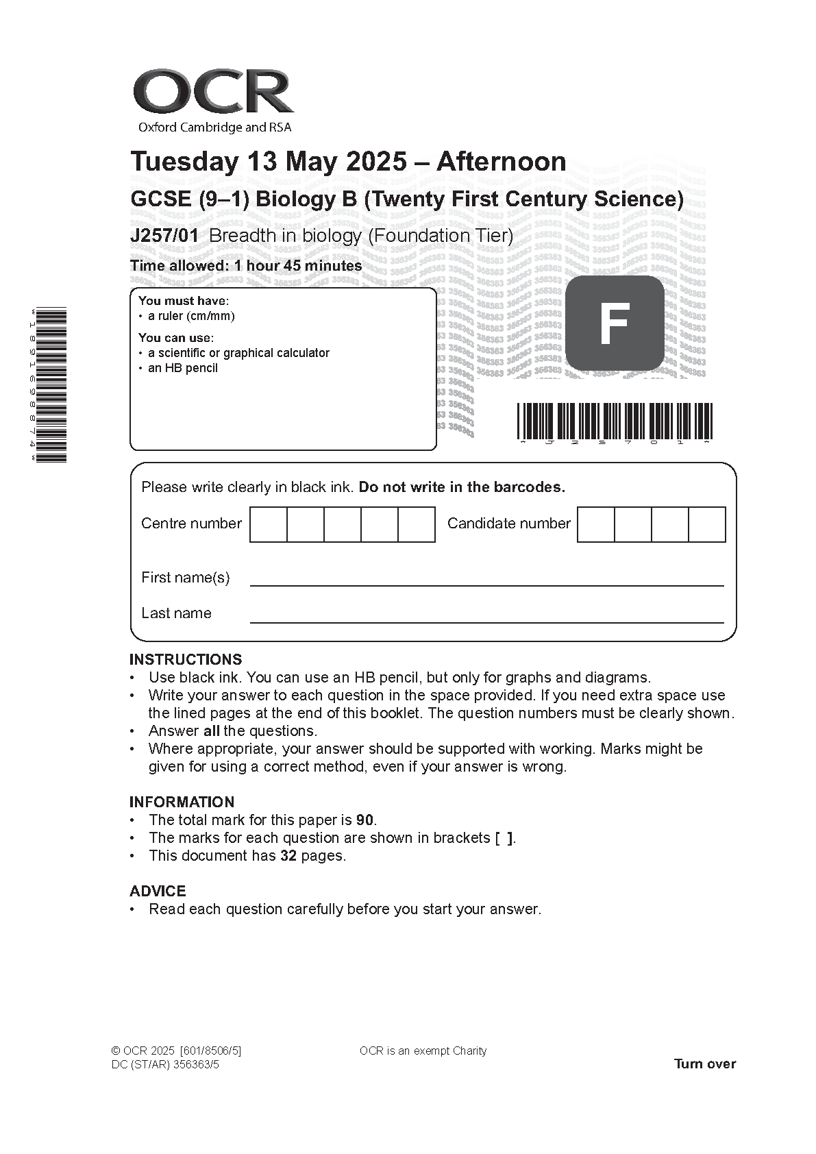 2025 OCR GCSE Biology B Twenty First Century Science Paper 1 and Mark Scheme Combined (J257/01 Breadth in biology (Foundation Tier))