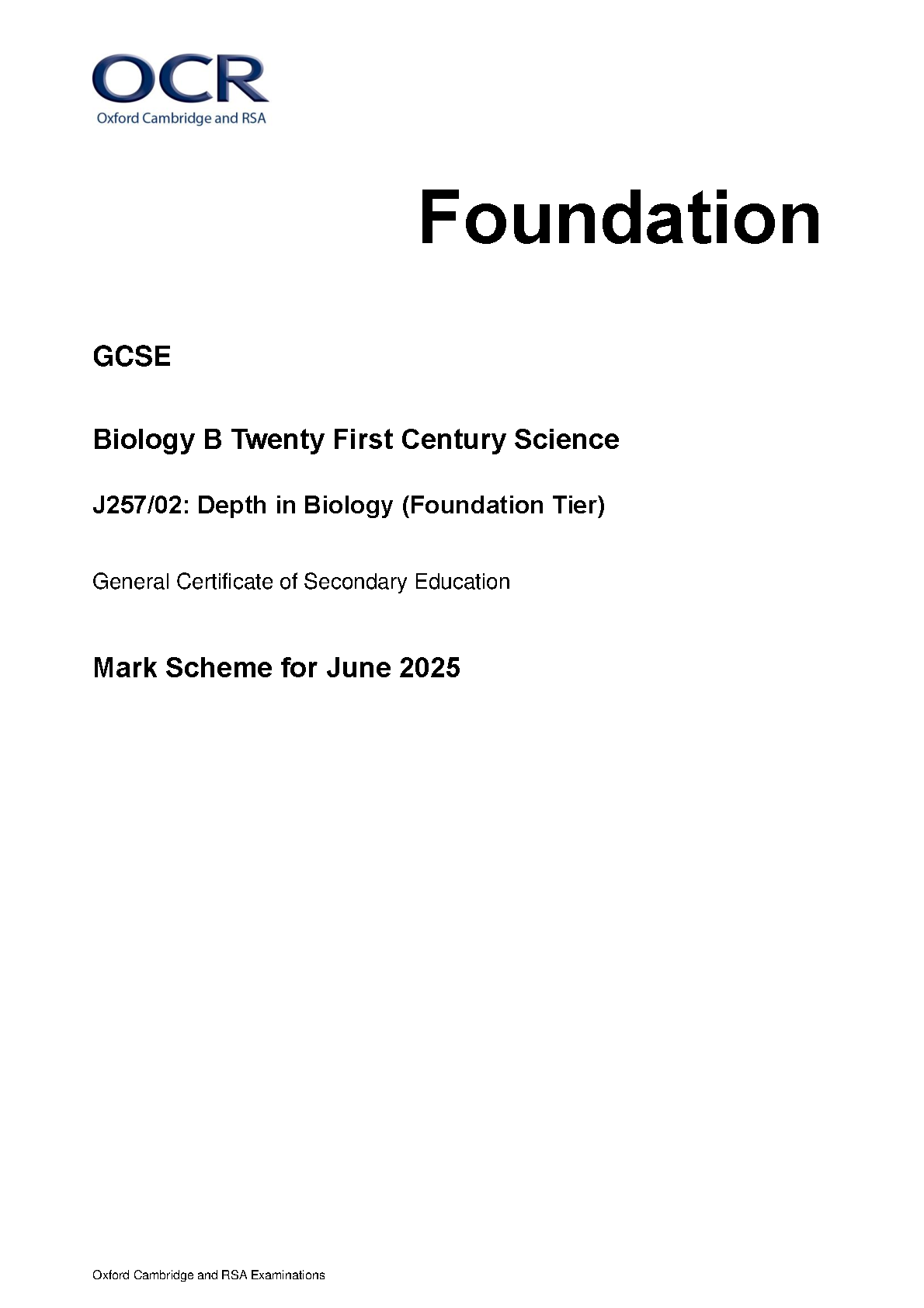 This resource includes the 2025 OCR GCSE Biology B (Twenty First Century Science) Paper 2: Depth in Biology (Foundation Tier) combined with the official mark scheme for specification J257/02.