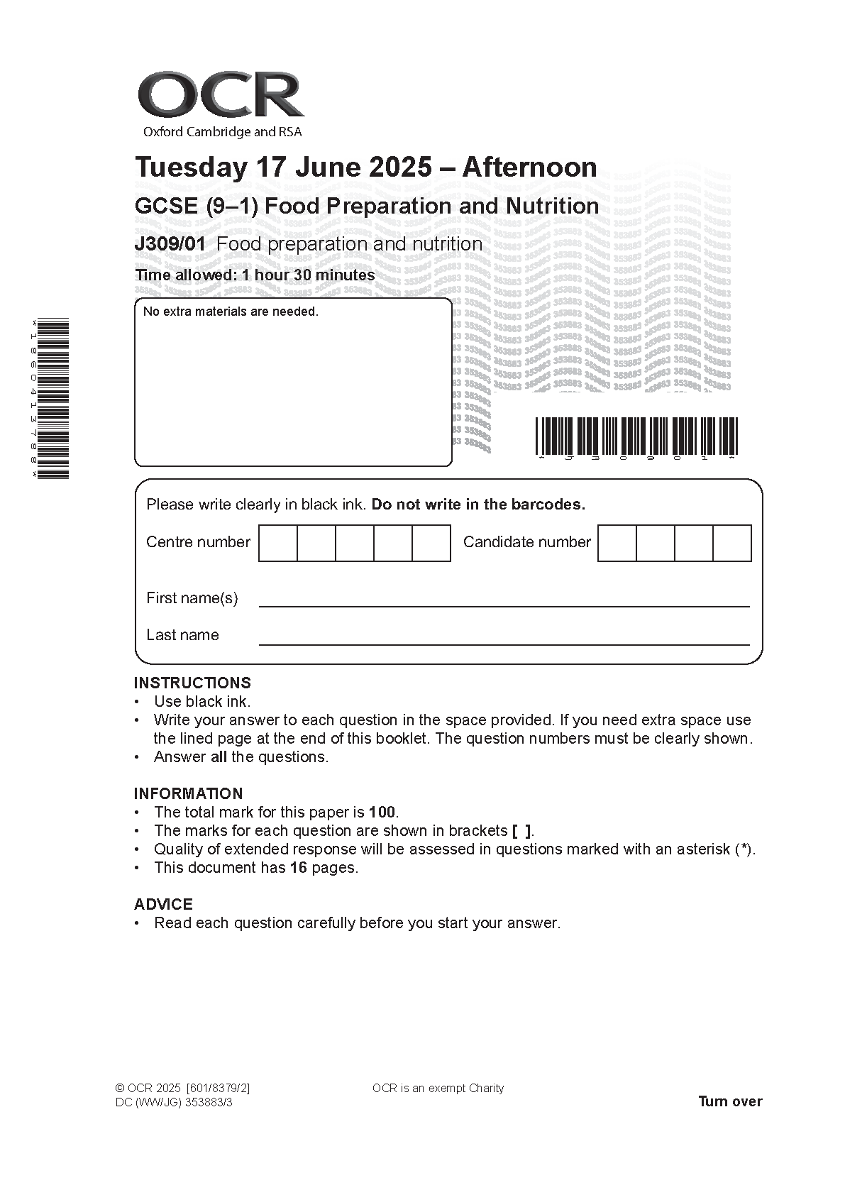 2025 OCR GCSE Food Preparation and Nutrition Paper 1 and Mark Scheme Combined (J309/01 Food preparation and nutrition )