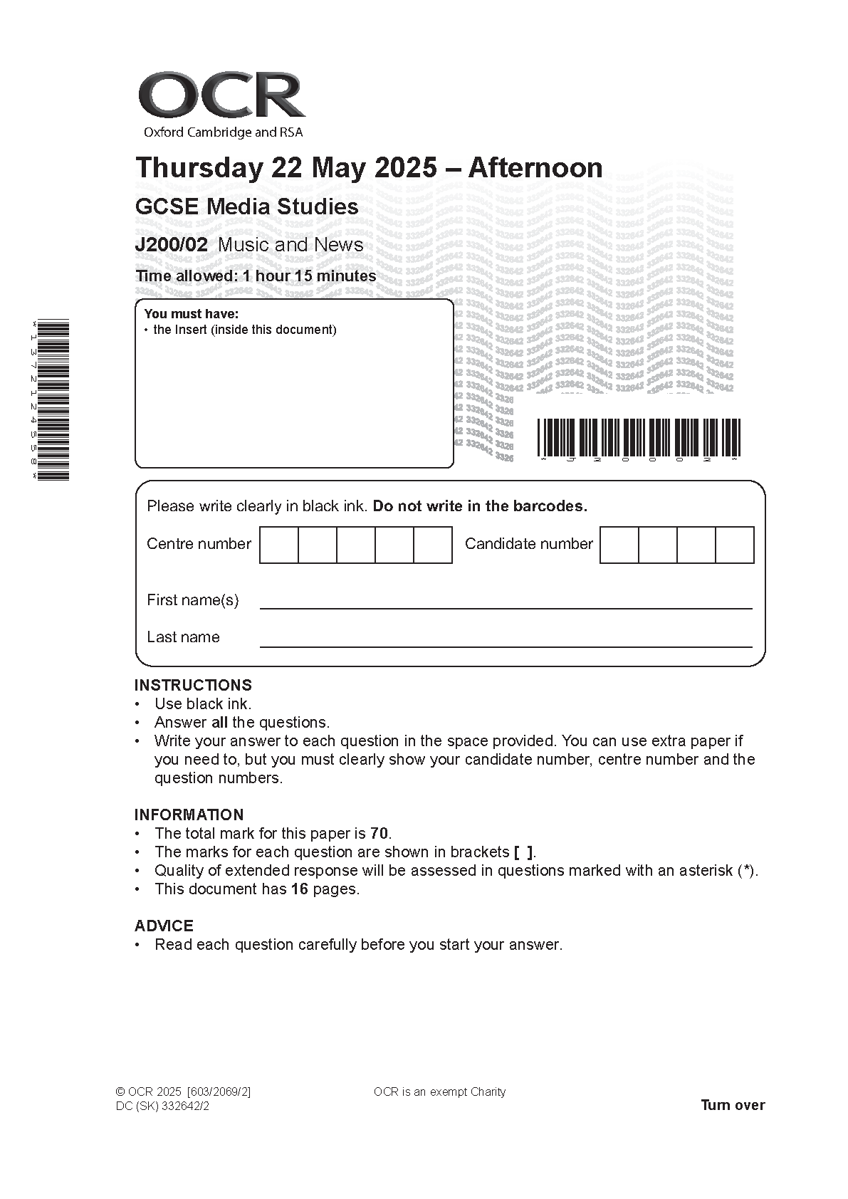 2025 OCR GCSE Media Studies Paper 2 and Mark Scheme Combined (J200/02 Music and News )