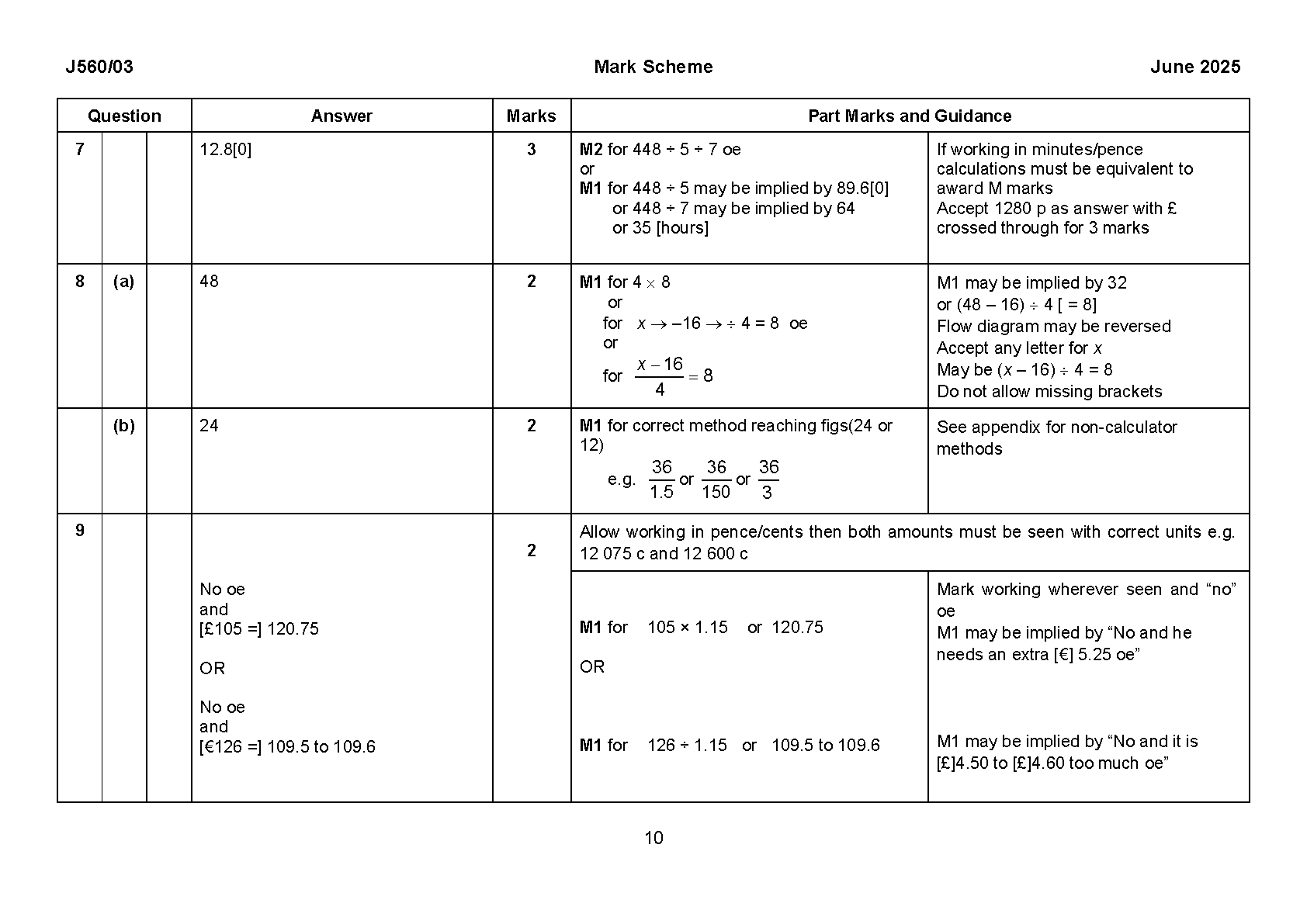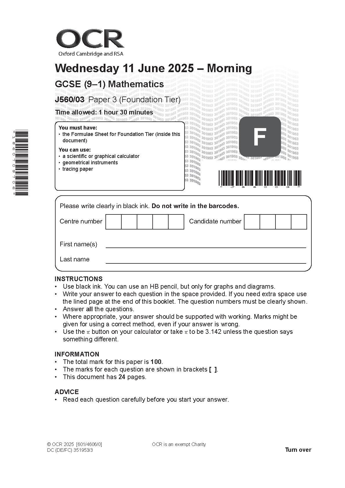 2025 OCR GCSE Mathematics Paper 3 and Mark Scheme Combined (J560/03 Paper 3 (Foundation Tier)