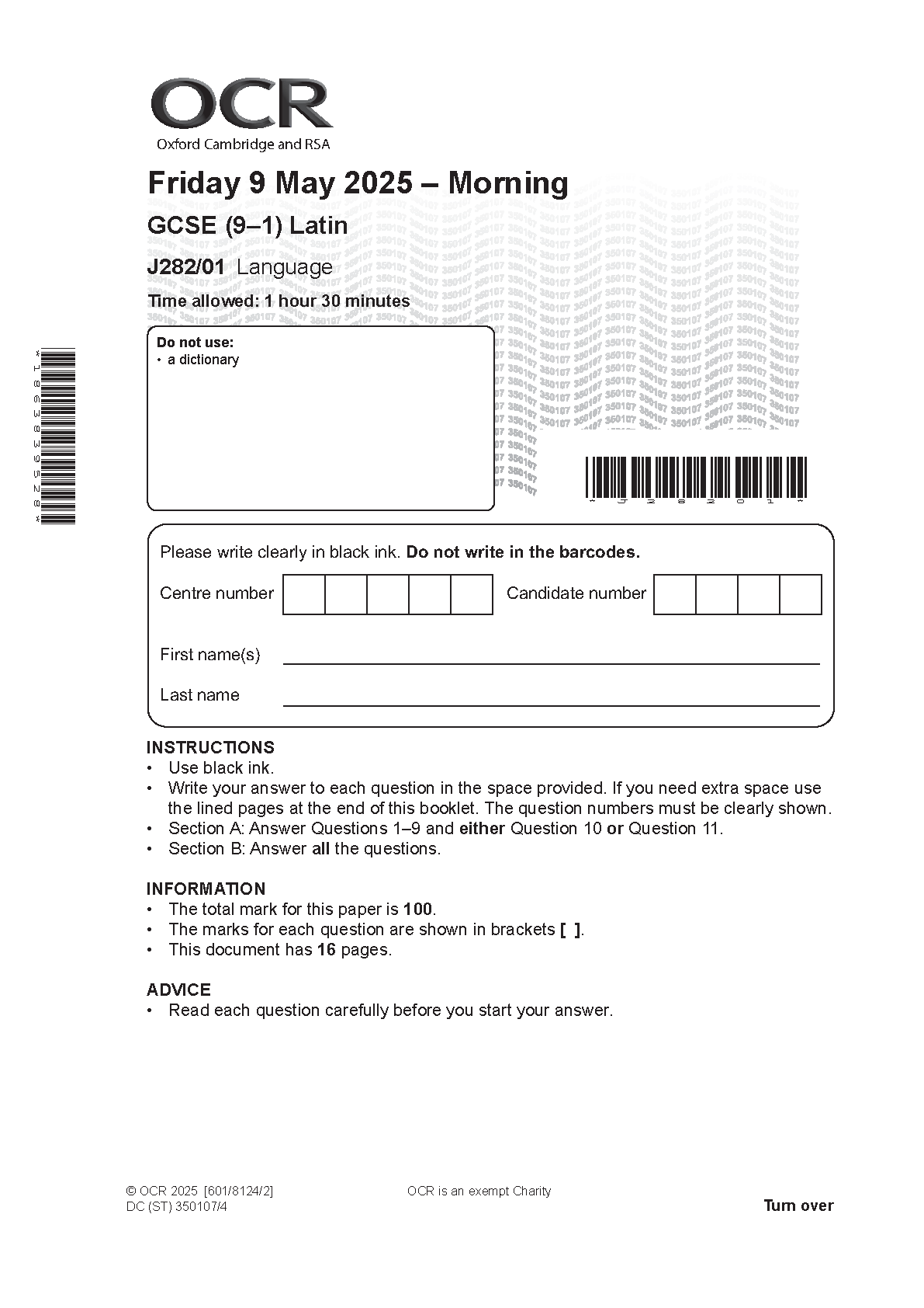 2025 OCR GCSE Latin Paper 1 and Mark Scheme Combined (J282/01 Language)