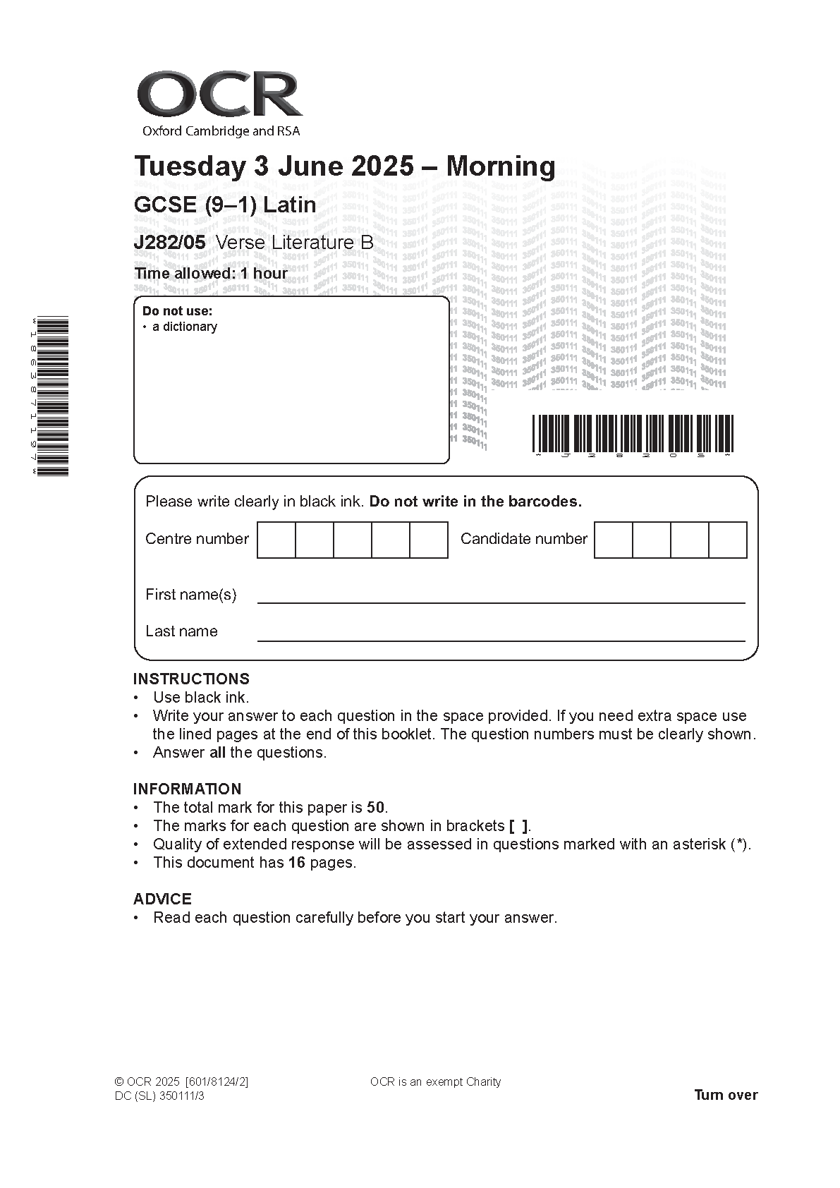 2025 OCR GCSE Latin Paper 5 and Mark Scheme Combined (J282/05 Verse Literature B)