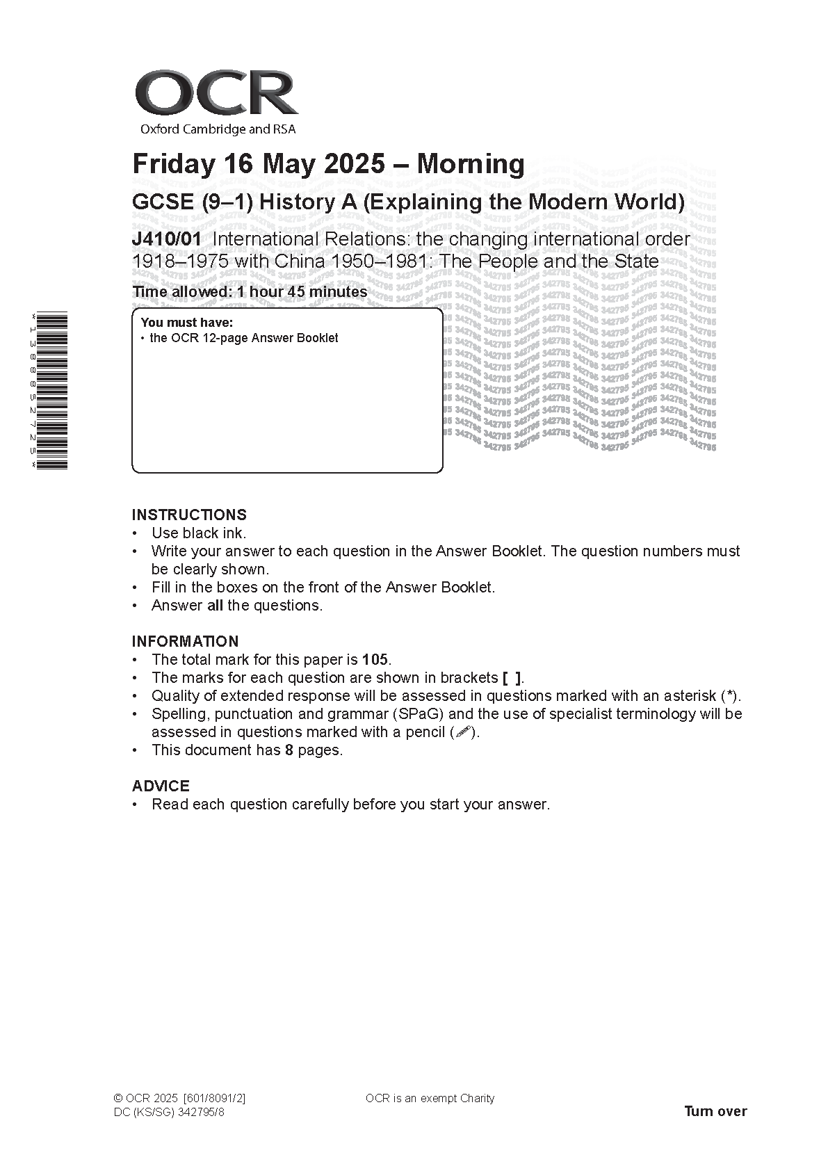 2025 OCR GCSE History A (Explaining the Modern World) Paper 1 and Mark Scheme Combined (J410/01 International Relations: the changing international order 1918–1975 with China 1950–1981: The People and the State )