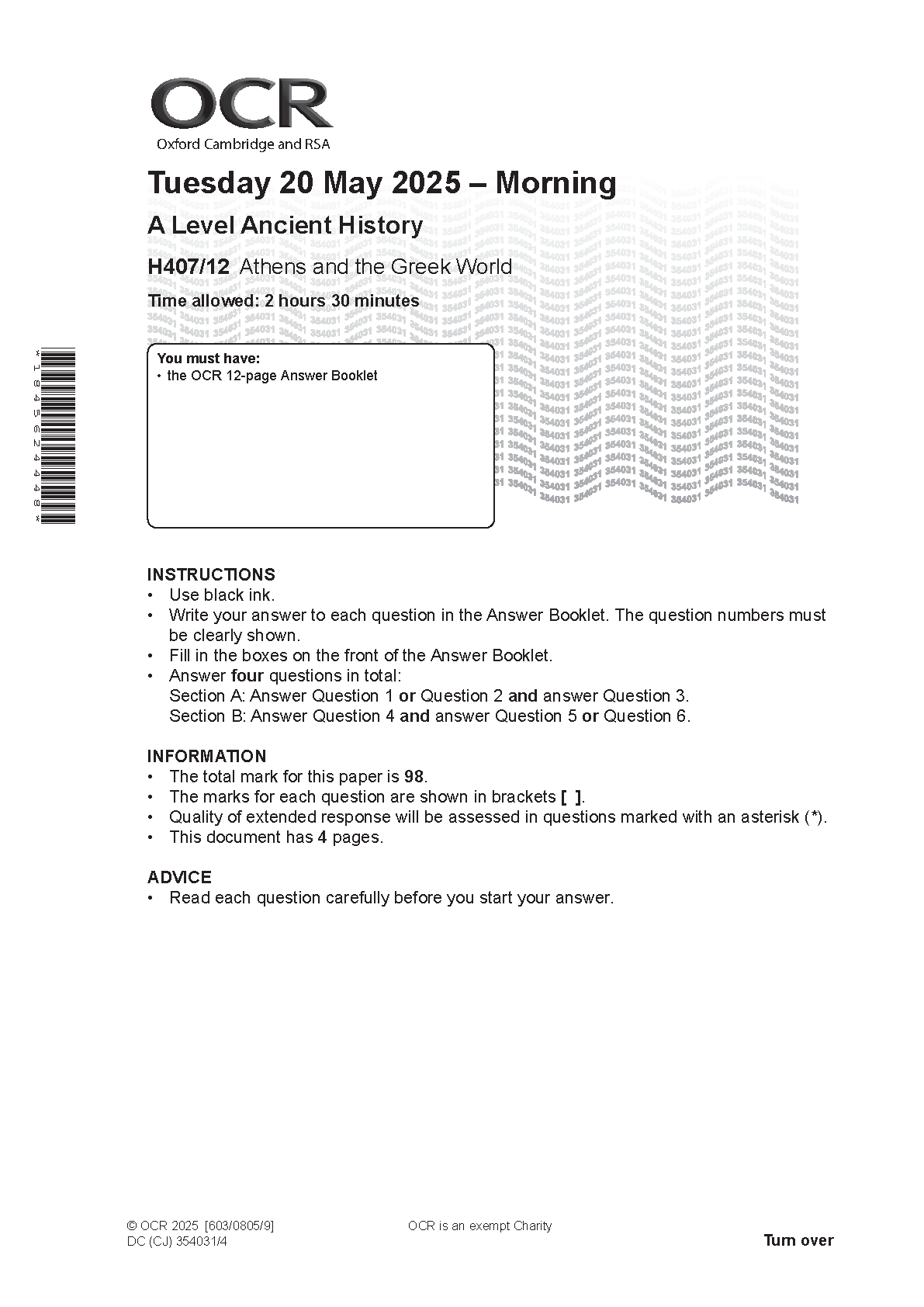 2025 OCR A Level Ancient History Paper 12 and Mark Scheme Combined (H407/12 Athens and the Greek World)