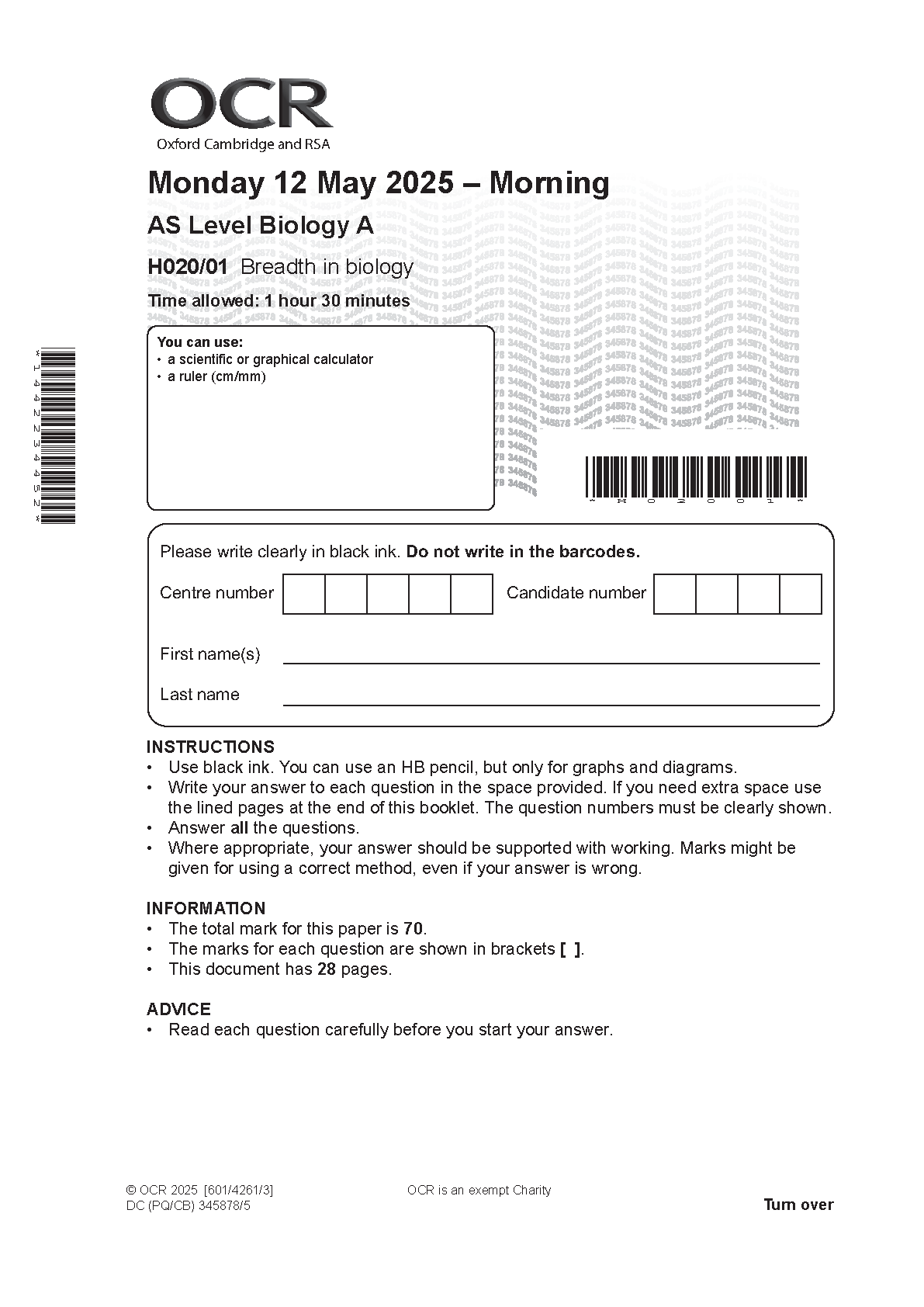 2025 OCR AS Level Biology A Paper 1 and Mark Scheme Combined (H020/01 Breadth in biology)