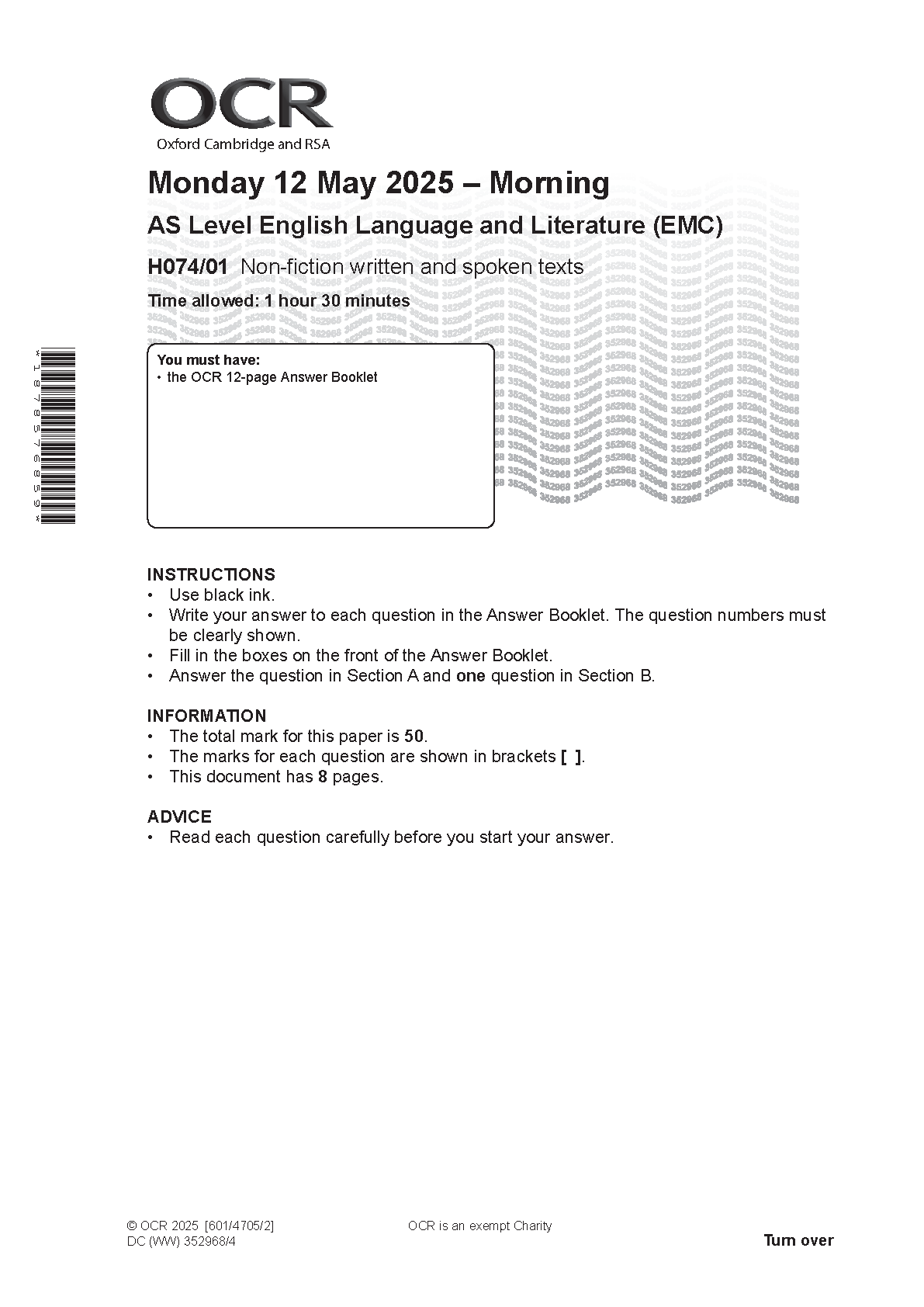 2025 OCR AS Level English Language and Literature Paper 1 and Mark Scheme Combined (H074/01 Non-fiction written and spoken texts)